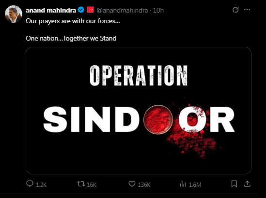 ਬਿਜ਼ਨਸ ਡੈਸਕ : 'ਆਪ੍ਰੇਸ਼ਨ ਸਿੰਦੂਰ' ਤਹਿਤ ਭਾਰਤੀ ਫੌਜ ਵੱਲੋਂ ਕੀਤੀ ਗਈ ਜਵਾਬੀ ਕਾਰਵਾਈ ਦੀ ਦੇਸ਼ ਭਰ ਤੋਂ ਪ੍ਰਸ਼ੰਸਾ ਹੋ ਰਹੀ ਹੈ। ਪਹਿਲਗਾਮ ਹਮਲੇ ਦੇ ਜਵਾਬ ਵਿੱਚ ਕੀਤੀ ਗਈ ਇਸ ਫੌਜੀ ਕਾਰਵਾਈ ਨੇ ਪੂਰੇ ਦੇਸ਼ ਦਾ ਧਿਆਨ ਆਪਣੇ ਵੱਲ ਖਿੱਚਿਆ ਹੈ। ਇਸੇ ਕ੍ਰਮ ਵਿੱਚ, ਉਦਯੋਗਪਤੀ ਆਨੰਦ ਮਹਿੰਦਰਾ ਨੇ ਵੀ ਫੌਜ ਦੇ ਇਸ ਦਲੇਰਾਨਾ ਕਦਮ ਦੀ ਖੁੱਲ੍ਹ ਕੇ ਪ੍ਰਸ਼ੰਸਾ ਕੀਤੀ ਹੈ। ਉਸਨੇ ਸੋਸ਼ਲ ਮੀਡੀਆ 'ਤੇ ਲਿਖਿਆ "ਸਾਡੀਆਂ ਪ੍ਰਾਰਥਨਾਵਾਂ ਸਾਡੀਆਂ ਫੌਜਾਂ ਦੇ ਨਾਲ ਹਨ... ਇੱਕ ਰਾਸ਼ਟਰ ਦੇ ਰੂਪ ਵਿੱਚ ਅਸੀਂ ਇਕੱਠੇ ਖੜ੍ਹੇ ਹਾਂ" ।