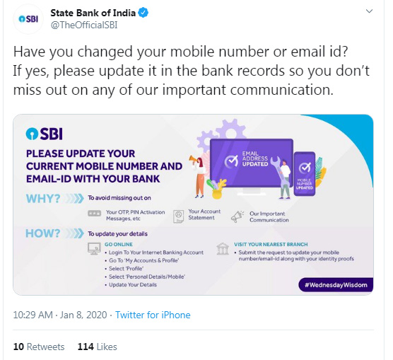 ਐੱਸ.ਬੀ.ਆਈ. ਨੇ ਆਪਣੇ ਅਧਿਕਾਰਿਕ ਟਵਿੱਟਰ ਅਕਾਊਂਟ 'ਤੇ ਟਵੀਟ ਕਰਕੇ ਐੱਸ.ਬੀ.ਆਈ. ਗਾਹਕਾਂ ਨੂੰ ਮੋਬਾਇਲ ਨੰਬਰ ਅਤੇ ਈਮੇਲ ਅਪਡੇਟ ਕਰਨ ਲਈ ਕਿਹਾ ਹੈ। ਟਵੀਟ 'ਚ ਬੈਂਕ ਨੇ ਕਿਹਾ ਕਿ ਗਾਹਕ ਆਪਣਾ ਮੋਬਾਇਲ ਨੰਬਰ ਅਤੇ ਈ-ਮੇਲ ਆਈ.ਡੀ. ਤੁਰੰਤ ਅਪਡੇਟ ਕਰਵਾ ਲਿਆ ਤਾਂ ਜੋ ਕੋਈ ਵੀ ਮੁੱਖ ਜਾਣਕਾਰੀ ਛੁੱਟ ਨਾ ਜਾਵੇ।