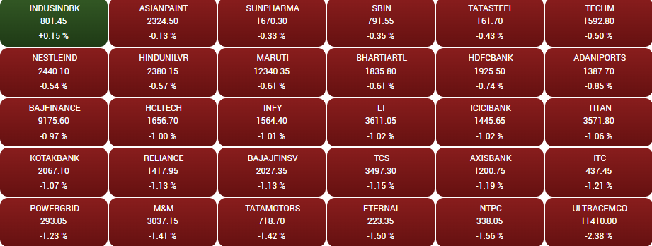 ਸੈਂਸੈਕਸ ਦੀਆਂ 30 ਕੰਪਨੀਆਂ ਵਿੱਚੋਂ, NTPC, ਮਹਿੰਦਰਾ ਐਂਡ ਮਹਿੰਦਰਾ, ਬਜਾਜ ਫਿਨਸਰਵ, HCL ਟੈਕ, ਈਟਰਨਲ (ਪਹਿਲਾਂ ਜ਼ੋਮੈਟੋ), ਟਾਟਾ ਕੰਸਲਟੈਂਸੀ ਸਰਵਿਸਿਜ਼, ਇਨਫੋਸਿਸ, ਅਲਟਰਾਟੈਕ ਸੀਮੈਂਟ, ਐਕਸਿਸ ਬੈਂਕ ਅਤੇ ਟਾਟਾ ਮੋਟਰਜ਼ ਘਾਟੇ ਵਿੱਚ ਸਨ। ਸਿਰਫ਼ ਇੰਡਸਇੰਡ ਬੈਂਕ ਦੇ ਸ਼ੇਅਰ ਹੀ ਮੁਨਾਫ਼ੇ ਵਿੱਚ ਰਹੇ।