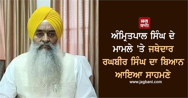 ਸ੍ਰੀ ਕੇਸਗੜ੍ਹ ਸਾਹਿਬ (ਚੋਵੇਸ਼ ਲਟਾਵਾ)- ਤਖ਼ਤ ਸ੍ਰੀ ਕੇਸਗੜ੍ਹ ਸਾਹਿਬ ਦੇ ਜਥੇਦਾਰ ਸਿੰਘ ਸਾਹਿਬ ਗਿਆਨੀ ਰਘਬੀਰ ਸਿੰਘ ਨੇ ਅੰਮ੍ਰਿਤਪਾਲ ਸਿੰਘ ਦੇ ਮਾਮਲੇ ਵਿਚ ਅਹਿਮ ਬਿਆਨ ਦਿੱਤਾ ਹੈ। ਅੰਮ੍ਰਿਤਪਾਲ ਨੂੰ ਲੈ ਕੇ ਗਿਆਨੀ ਰਘਬੀਰ ਸਿੰਘ ਨੇ ਕਿਹਾ ਕਿ ਅੰਮ੍ਰਿਤਪਾਲ ਤੋਂ ਐੱਨ. ਐੱਸ. ਏ. ਹਟਾਈ ਜਾਵੇ। ਇਸ ਦੇ ਨਾਲ ਹੀ ਉਨ੍ਹਾਂ ਵੱਲੋਂ ਸਰਕਾਰ ਨੂੰ ਬੇਕਸੂਰ ਨੌਜਵਾਨਾਂ ਨੂੰ ਜਲਦੀ ਹੀ ਰਿਹਾਅ ਕਰਨ ਦੀ ਮੰਗ ਕੀਤੀ ਗਈ ਹੈ।