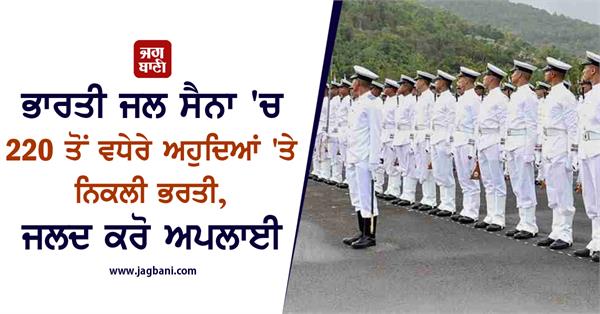ਨਵੀਂ ਦਿੱਲੀ - ਭਾਰਤੀ ਜਲ ਸੈਨਾ ਨੇ ਸ਼ਾਰਟ ਸਰਵਿਸ ਕਮਿਸ਼ਨ ਅਫਸਰ ਭਰਤੀ ਲਈ ਨੋਟੀਫਿਕੇਸ਼ਨ ਜਾਰੀ ਕੀਤਾ ਹੈ। B.Tech, B.Sc, M.Tech, M.Sc, MBA ਨੌਜਵਾਨਾਂ ਲਈ ਸ਼ਾਰਟ ਸਰਵਿਸ ਕਮਿਸ਼ਨ ਅਫਸਰ (SSC ਅਫਸਰ) ਦੀਆਂ 224 ਅਸਾਮੀਆਂ ਲਈ ਭਰਤੀ ਕੱਢੀ ਗਈ ਹੈ। ਯੋਗ ਅਤੇ ਚਾਹਵਾਨ ਉਮੀਦਵਾਰ ਅਧਿਕਾਰਤ ਵੈੱਬਸਾਈਟ www.joinindiannavy.gov.in 'ਤੇ ਜਾ ਕੇ 29 ਅਕਤੂਬਰ 2023 ਤੱਕ ਅਪਲਾਈ ਕਰ ਸਕਦੇ ਹਨ।