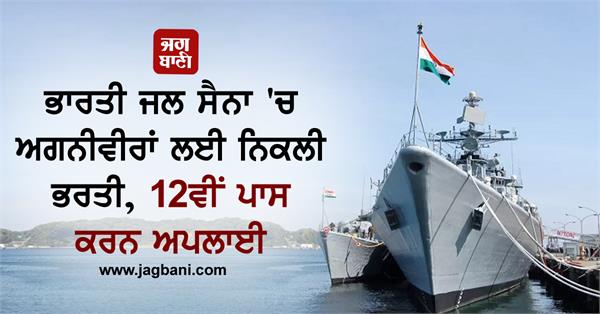 ਨਵੀਂ ਦਿੱਲੀ- ਭਾਰਤੀ ਜਲ ਸੈਨਾ ਨੇ ਅਗਨੀਵੀਰਾਂ ਦੇ 1300 ਤੋਂ ਵਧੇਰੇ ਖ਼ਾਲੀ ਅਹੁਦਿਆਂ 'ਤੇ ਭਰਤੀਆਂ ਕੱਢੀਆਂ ਹਨ। ਯੋਗ ਉਮੀਦਵਾਰ ਅਧਿਕਾਰਤ ਵੈੱਬਸਾਈਟ 'ਤੇ ਜਾ ਕੇ ਅਪਲਾਈ ਕਰ ਸਕਦੇ ਹਨ।