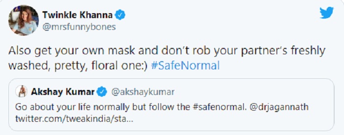 ਉਥੇ ਹੀ ਅਕਸ਼ੈ ਕੁਮਾਰ ਦੇ ਇਸ ਟਵੀਟ ਨੂੰ ਰਿਟਵੀਟ ਕਰਦੇ ਹੋਏ ਟਵਿੰਕਲ ਖੰਨਾ ਨੇ ਆਪਣੇ ਪਤੀ ਦੀ ਕਾਫ਼ੀ ਖਿੱਚਾਈ ਕੀਤੀ ਹੈ। ਉਨ੍ਹਾਂ ਨੇ ਲਿਖਿਆ ਹੈ ਕਿ 'ਤੁਸੀਂ ਆਪਣਾ ਖ਼ੁਦ ਦਾ ਮਾਸਕ ਲਗਾਓ ਅਤੇ ਆਪਣੇ ਪਾਰਟਨਰ ਦਾ ਧੋਇਆ ਹੋਇਆ, ਸੁੰਦਰ ਤੇ ਫੁੱਲਾਂ ਵਾਲੇ ਪ੍ਰਿੰਟ ਵਾਲਾ ਮਾਸਕ ਨਾ ਚੋਰੀ ਕਰੋ।