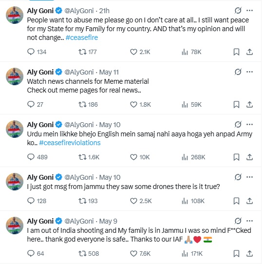 ਟੀਵੀ ਅਦਾਕਾਰ ਅਲੀ ਗੋਨੀ, ਜੋ ਕਿ ਜੰਮੂ-ਕਸ਼ਮੀਰ ਤੋਂ ਹਨ, ਨੇ ਆਪਣੇ ਐਕਸ ਅਕਾਊਂਟ 'ਤੇ ਲਿਖਿਆ - 'ਉਰਦੂ ਵਿੱਚ ਲਿਖ ਕੇ ਭੇਜੋ, ਅਨਪੜ੍ਹ ਫੌਜ ਨੂੰ ਸ਼ਾਇਦ ਅੰਗਰੇਜ਼ੀ ਸਮਝ ਨਹੀਂ ਆਈ ਹੋਵੇਗੀ...ਸ਼ੀਜ਼ਫਾਇਰ ਉਲੰਘਣਾ।'