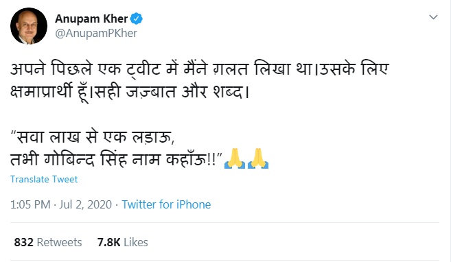 ਜਲੰਧਰ (ਵੈੱਬ ਡੈਸਕ) — ਅਦਾਕਾਰ ਅਨੁਪਮ ਖੇਰ ਨੇ ਹਾਲ ਹੀ 'ਚ ਆਪਣੇ ਇੱਕ ਟਵੀਟ ਨਾਲ ਮੁੜ ਵਿਵਾਦਾਂ ਨੂੰ ਸਹੇੜ ਲਿਆ। ਉਨ੍ਹਾਂ ਨੇ ਆਪਣੇ ਟਵਿੱਟਰ ਅਕਾਊਂਟ ਤੋਂ ਇੱਕ ਟਵੀਟ ਕੀਤਾ ਸੀ, ਜਿਸ 'ਚ ਉਨ੍ਹਾਂ ਨੇ ਭਾਜਪਾ ਦੇ ਬੁਲਾਰੇ ਸਾਂਬਿਤ ਪਾਤਰਾ ਲਈ ਗੁਰੂ ਗੋਬਿੰਦ ਸਿੰਘ ਜੀ ਦੀਆਂ ਉਚਾਰੀਆਂ ਤੁਕਾਂ ਦਾ ਗ਼ਲਤ ਇਸਤੇਮਾਲ ਕੀਤਾ ਸੀ। ਉਨ੍ਹਾਂ ਲਿਖਿਆ 'ਸਵਾ ਲਾਖ ਸੇ ਏਕ ਭਿੜਾ ਦੂੰ'। ਇਹ ਟਵੀਟ ਉਨ੍ਹਾਂ ਨੇ ਸਾਂਬਿਤ ਸਵਰਾਜ ਨੂੰ ਟੈਗ ਕੀਤਾ ਹੈ। ਇਸ ਤੋਂ ਬਾਅਦ ਇਹ ਮੁੱਦਾ ਕਾਫ਼ੀ ਭੱਖਦਾ ਗਿਆ ਹੈ, ਜਿਸ ਨੂੰ ਦੇਖਦਿਆਂ ਅਨੁਪਮ ਖੇਰ ਨੇ ਟਵੀਟ ਕਰਦਿਆਂ ਮੁਆਫ਼ੀ ਮੰਗੀ। ਉਨ੍ਹਾਂ ਨੇ ਆਪਣੇ ਟਵੀਟ 'ਚ ਲਿਖਿਆ, 'ਆਪਣੇ ਪਿਛਲੇ ਇੱਕ ਟਵੀਟ 'ਚ ਮੈਂ ਗ਼ਲਤ ਲਿਖਿਆ ਸੀ। ਉਸ ਲਈ ਮੈਂ ਮੁਆਫ਼ੀ ਮੰਗਦਾ ਹਾਂ। ਸਹੀ ਜਜ਼ਬਾਤ ਅਤੇ ਸ਼ਬਦ। 'ਸਵਾ ਲਾਖ ਸੇ ਏਕ ਲੜਾਊਂ ਤਬੈ ਗੋਬਿੰਦ ਸਿੰਘ ਨਾਮ ਕਹਾਊਂ'।