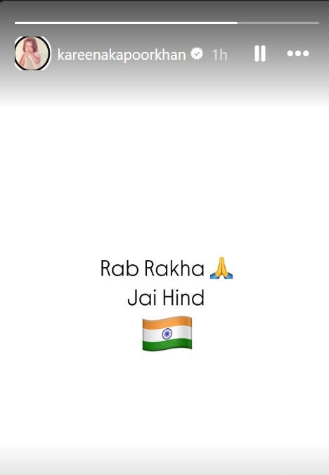 ਅਦਾਕਾਰਾ ਕਰੀਨਾ ਕਪੂਰ ਨੇ ਵੀ ਇੱਕ ਇੰਸਟਾਗ੍ਰਾਮ ਸਟੋਰੀ ਸਾਂਝੀ ਕੀਤੀ ਅਤੇ ਲਿਖਿਆ "ਰੱਬ ਰੱਖਾ, ਜੈ ਹਿੰਦ।" ਇਸ ਦੇ ਨਾਲ ਹੀ ਫਿਲਮ ਨਿਰਮਾਤਾ ਕਰਨ ਜੌਹਰ ਨੇ ਵੀ ਜੰਗਬੰਦੀ 'ਤੇ ਆਪਣੀ ਪ੍ਰਤੀਕਿਰਿਆ ਦਿੱਤੀ। ਉਨ੍ਹਾਂ ਨੇ ਇੱਕ ਖ਼ਬਰ ਦੁਬਾਰਾ ਸਾਂਝੀ ਕੀਤੀ ਅਤੇ ਹੱਥ ਜੋੜ ਕੇ ਇੱਕ ਦਿਲ ਵਾਲਾ ਇਮੋਜੀ ਪੋਸਟ ਕੀਤਾ।