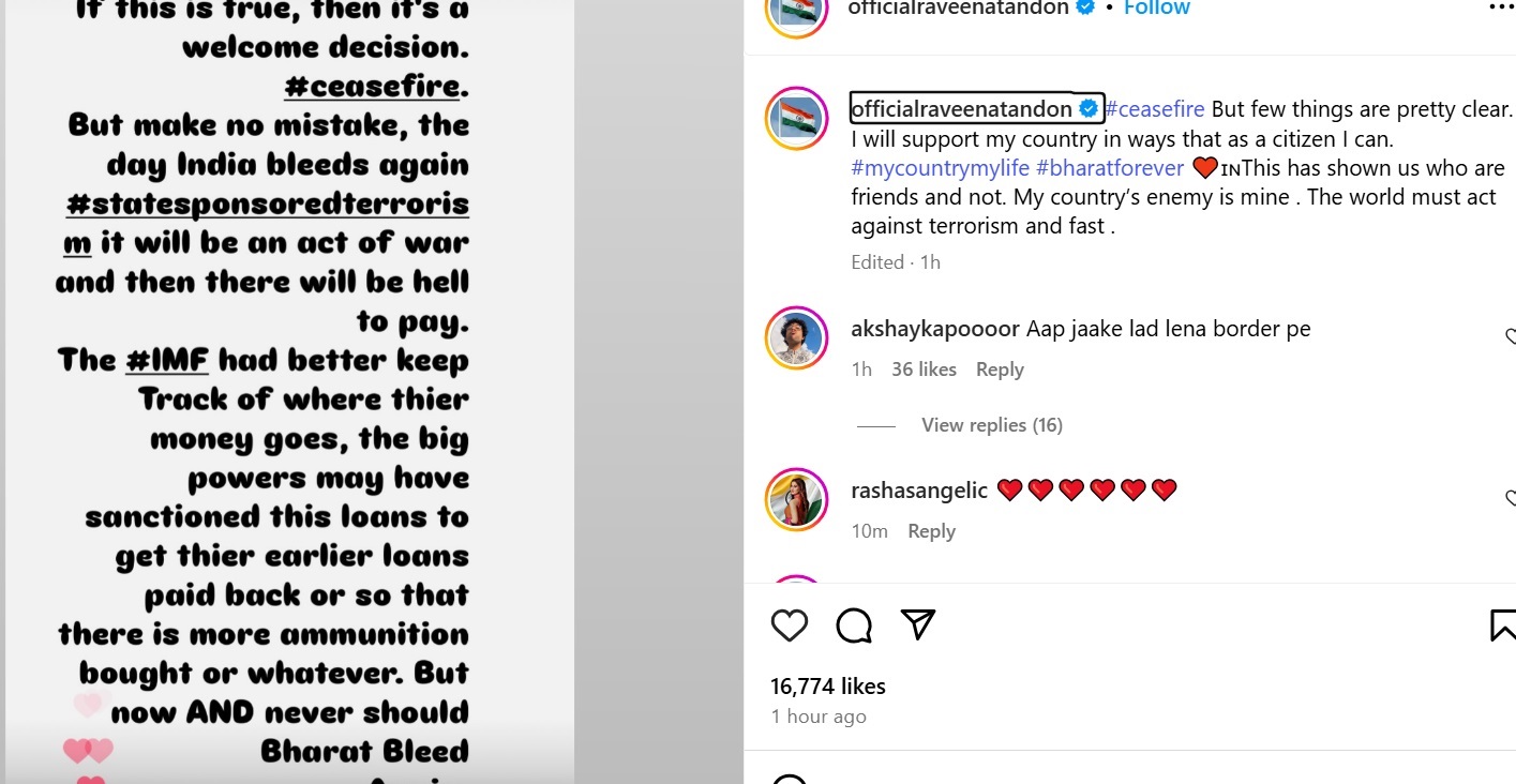 ਅਦਾਕਾਰਾ ਰਵੀਨਾ ਟੰਡਨ ਨੇ ਆਪਣੇ ਆਈਜੀ ਹੈਂਡਲ 'ਤੇ ਲਿਖਿਆ, "ਜੇਕਰ ਇਹ ਸੱਚ ਹੈ, ਤਾਂ ਇਹ ਇੱਕ ਸਵਾਗਤਯੋਗ ਫੈਸਲਾ ਹੈ। #ਸੀਜ਼ਫਾਇਰ।" ਹਾਲਾਂਕਿ ਅਦਾਕਾਰਾ ਨੇ ਪਾਕਿਸਤਾਨ ਨੂੰ ਭਾਰਤ ਵਿਰੁੱਧ ਕਿਸੇ ਵੀ ਹੋਰ ਕਾਰਵਾਈ ਵਿਰੁੱਧ ਚੇਤਾਵਨੀ ਵੀ ਦਿੱਤੀ। "#IMF ਨੂੰ ਬਿਹਤਰ ਢੰਗ ਨਾਲ ਪਤਾ ਲਗਾਉਣਾ ਚਾਹੀਦਾ ਹੈ ਕਿ ਉਨ੍ਹਾਂ ਦਾ ਪੈਸਾ ਕਿੱਥੇ ਜਾਂਦਾ ਹੈ, ਵੱਡੀਆਂ ਸ਼ਕਤੀਆਂ ਨੇ ਆਪਣੇ ਪਿਛਲੇ ਕਰਜ਼ਿਆਂ ਨੂੰ ਚੁਕਾਉਣ ਜਾਂ ਹੋਰ ਗੋਲਾ ਬਾਰੂਦ ਖਰੀਦਣ ਜਾਂ ਕੁਝ ਵੀ ਕਰਨ ਲਈ ਇਸ ਕਰਜ਼ੇ ਨੂੰ ਮਨਜ਼ੂਰੀ ਦਿੱਤੀ ਹੋਵੇਗੀ। ਪਰ ਹੁਣ ਅਤੇ ਕਦੇ ਵੀ ਭਾਰਤ ਨੂੰ ਦੁਬਾਰਾ ਖੂਨ ਨਹੀਂ ਵਹਾਉਣਾ। ਰਵੀਨਾ ਨੇ ਪੋਸਟ ਨੂੰ ਕੈਪਸ਼ਨ ਦਿੱਤੀ, "#ਜੰਗਬੰਦੀ ਪਰ ਕੁਝ ਗੱਲਾਂ ਬਿਲਕੁਲ ਸਪੱਸ਼ਟ ਹਨ। ਇੱਕ ਨਾਗਰਿਕ ਹੋਣ ਦੇ ਨਾਤੇ ਮੈਂ ਆਪਣੇ ਦੇਸ਼ ਦਾ ਹਰ ਸੰਭਵ ਤਰੀਕੇ ਨਾਲ ਸਮਰਥਨ ਕਰਾਂਗੀ। #ਮੇਰਾ ਦੇਸ਼ ਮੇਰਾ ਜੀਵਨ #ਭਾਰਤ ਹਮੇਸ਼ਾ ਲਈ ਇਸਨੇ ਸਾਨੂੰ ਦਿਖਾਇਆ ਹੈ ਕਿ ਕੌਣ ਦੋਸਤ ਹੈ ਅਤੇ ਕੌਣ ਨਹੀਂ। ਮੇਰੇ ਦੇਸ਼ ਦਾ ਦੁਸ਼ਮਣ ਮੇਰਾ ਦੁਸ਼ਮਣ ਹੈ।"