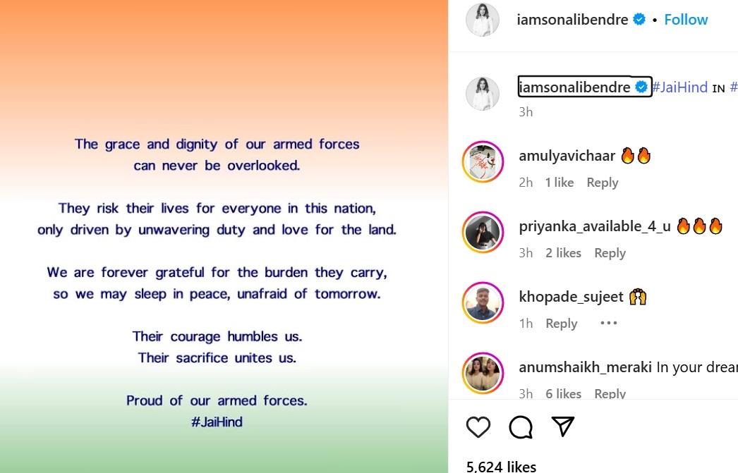 ਅਦਾਕਾਰਾ ਸੋਨਾਲੀ ਬੇਂਦਰੇ ਨੇ ਸਾਡੇ ਹਥਿਆਰਬੰਦ ਬਲਾਂ ਪ੍ਰਤੀ ਆਪਣੀ ਸ਼ੁਕਰਗੁਜ਼ਾਰੀ ਪ੍ਰਗਟ ਕੀਤੀ ਅਤੇ ਲਿਖਿਆ-"ਸਾਡੀਆਂ ਹਥਿਆਰਬੰਦ ਬਲਾਂ ਦੀ ਸ਼ਾਨ ਅਤੇ ਮਾਣ ਨੂੰ ਕਦੇ ਵੀ ਨਜ਼ਰਅੰਦਾਜ਼ ਨਹੀਂ ਕੀਤਾ ਜਾ ਸਕਦਾ। ਉਹ ਇਸ ਦੇਸ਼ ਦੇ ਹਰ ਕਿਸੇ ਲਈ ਆਪਣੀ ਜਾਨ ਜੋਖਮ ਵਿੱਚ ਪਾਉਂਦੇ ਹਨ, ਸਿਰਫ ਅਟੁੱਟ ਫਰਜ਼ ਅਤੇ ਧਰਤੀ ਪ੍ਰਤੀ ਪਿਆਰ ਦੁਆਰਾ ਪ੍ਰੇਰਿਤ।" "ਅਸੀਂ ਉਨ੍ਹਾਂ ਦੇ ਬੋਝ ਲਈ ਹਮੇਸ਼ਾ ਸ਼ੁਕਰਗੁਜ਼ਾਰ ਹਾਂ ਤਾਂ ਜੋ ਅਸੀਂ ਕੱਲ੍ਹ ਦੀ ਚਿੰਤਾ ਕੀਤੇ ਬਿਨਾਂ ਸ਼ਾਂਤੀ ਨਾਲ ਸੌਂ ਸਕੀਏ। ਉਨ੍ਹਾਂ ਦੀ ਹਿੰਮਤ ਸਾਨੂੰ ਨਿਮਰ ਬਣਾਉਂਦੀ ਹੈ। ਉਨ੍ਹਾਂ ਦੀ ਕੁਰਬਾਨੀ ਸਾਨੂੰ ਇਕਜੁੱਟ ਕਰਦੀ ਹੈ। ਆਪਣੀਆਂ ਹਥਿਆਰਬੰਦ ਸੈਨਾਵਾਂ 'ਤੇ ਮਾਣ ਹੈ। #ਜੈ ਹਿੰਦ," 'ਹਮ ਸਾਥ ਸਾਥ ਹੈਂ'।