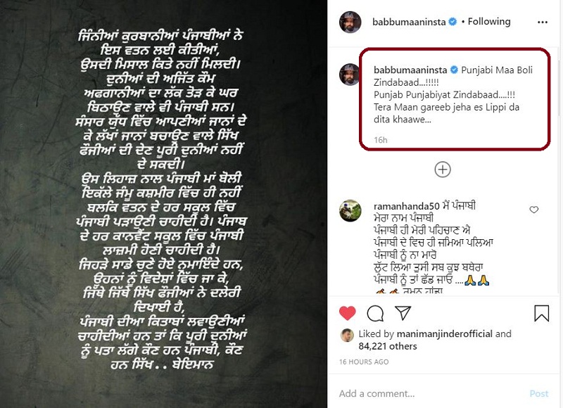 ਤੇਰਾ ਮਾਨ ਗਰੀਬ ਜਿਹਾ ਇਸ ਲਿੱਪੀ ਦਾ ਦਿੱਤਾ ਖਾਵੇ।' ਉਨ੍ਹਾਂ ਨੇ ਆਪਣੀ ਕਲਮ 'ਚੋਂ ਨਿਕਲੇ ਬੋਲਾਂ ਨੂੰ ਇੱਕ ਪੋਸਟਰ 'ਤੇ ਲਿਖ ਕੇ ਸਾਂਝਾ ਕੀਤਾ ਹੈ। ਪੋਸਟਰ 'ਚ ਬੱਬੂ ਮਾਨ ਨੇ ਲਿਖਿਆ ਹੈ– 'ਜਿੰਨੀਆਂ ਕੁਰਬਾਨੀਆਂ ਪੰਜਾਬੀਆਂ ਨੇ ਇਸ ਵਤਨ ਲਈ ਕੀਤੀਆਂ, ਉਸ ਦੀ ਮਿਸਾਲ ਕਿਤੇ ਨਹੀਂ ਮਿਲਦੀ। ਦੁਨੀਆ ਦੀ ਅਜਿੱਤ ਕੌਮ ਅਫਗਾਨੀਆਂ ਦਾ ਲੱਕ ਤੋੜ ਕੇ ਘਰ ਬਿਠਾਉਣ ਵਾਲੇ ਵੀ ਪੰਜਾਬੀ ਸਨ। ਸੰਸਾਰ ਯੁੱਧ 'ਚ ਆਪਣੀਆਂ ਜਾਨਾਂ ਦੇ ਕੇ ਲੱਖਾਂ ਜਾਨਾਂ ਬਚਾਉਣ ਵਾਲੇ ਸਿੱਖ ਫੌਜੀਆਂ ਦੀ ਦੇਣ ਪੂਰੀ ਦੁਨੀਆ ਨਹੀਂ ਦੇ ਸਕਦੀ। ਉਸ ਲਿਹਾਜ਼ ਨਾਲ ਪੰਜਾਬੀ ਮਾਂ ਬੋਲੀ ਇਕੱਲੇ ਜੰਮੂ ਕਸ਼ਮੀਰ 'ਚ ਨਹੀਂ ਸਗੋਂ ਵਤਨ ਦੇ ਹਰ ਸਕੂਲ 'ਚ ਪੰਜਾਬੀ ਪੜਾਉਣੀ ਚਾਹੀਦੀ ਹੈ। ਪੰਜਾਬ ਦੇ ਹਰ ਕਾਨਵੈਂਟ ਸਕੂਲ 'ਚ ਪੰਜਾਬੀ ਲਾਜ਼ਮੀ ਹੋਣੀ ਚਾਹੀਦੀ ਹੈ। ਜਿਹੜੇ ਸਾਡੇ ਚੁਣੇ ਹੋਏ ਨੁਮਾਇੰਦੇ ਹਨ, ਉਨ੍ਹਾਂ ਨੂੰ ਵਿਦੇਸ਼ਾਂ 'ਚ ਜਾ ਕੇ, ਜਿਥੇ ਸਿੱਖ ਫੌਜੀਆਂ ਨੇ ਦਲੇਰੀ ਦਿਖਾਈ ਹੈ, ਪੰਜਾਬੀ ਦੀਆਂ ਕਿਤਾਬਾਂ ਲਵਾਉਣੀਆਂ ਚਾਹੀਦੀਆਂ ਹਨ ਤਾਂ ਕਿ ਪੂਰੀ ਦੁਨੀਆ ਨੂੰ ਪਤਾ ਲੱਗੇ ਕੌਣ ਹਨ ਪੰਜਾਬੀ, ਕੌਣ ਹਨ ਸਿੱਖ...ਬੇਇਮਾਨ।'