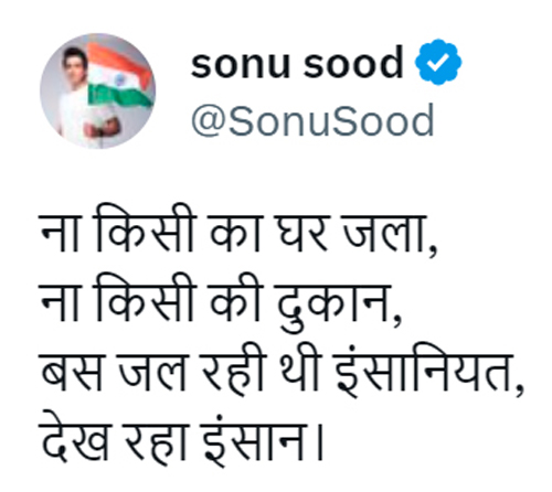 ਉਥੇ ਬਾਲੀਵੁੱਡ ਅਦਾਕਾਰ ਸੋਨੂੰ ਸੂਦ ਨੇ ਲਿਖਿਆ, ‘‘ਨਾ ਕਿਸੇ ਦਾ ਘਰ ਸੜਿਆ, ਨਾ ਕਿਸੇ ਦੀ ਦੁਕਾਨ, ਸਿਰਫ਼ ਸੜ ਰਹੀ ਸੀ ਇਨਸਾਨੀਅਤ, ਦੇਖ ਰਿਹਾ ਸੀ ਇਨਸਾਨ।’’