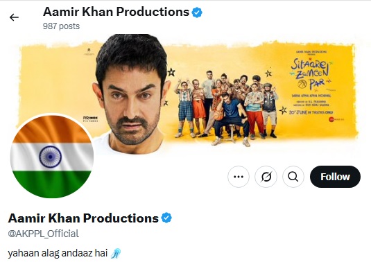 ਸ਼ੁੱਕਰਵਾਰ ਨੂੰ ਬਹੁਤ ਸਾਰੇ ਪ੍ਰਸ਼ੰਸਕਾਂ ਨੇ ਦੇਖਿਆ ਕਿ ਆਮਿਰ ਖਾਨ ਦੇ ਪ੍ਰੋਡਕਸ਼ਨ ਹਾਊਸ ਦੇ ਡੀਪੀ 'ਤੇ ਉਸਦੇ ਅਧਿਕਾਰਤ ਲੋਗੋ ਦੀ ਬਜਾਏ ਤਿਰੰਗਾ ਸੀ। ਤਿੰਨੋਂ ਸੋਸ਼ਲ ਮੀਡੀਆ ਪਲੇਟਫਾਰਮ ਇੰਸਟਾਗ੍ਰਾਮ ਐਕਸ ਅਤੇ ਫੇਸਬੁੱਕ 'ਤੇ ਡੀਪੀ ਬਦਲ ਦਿੱਤੀ ਗਈ ਸੀ। ਸੋਸ਼ਲ ਮੀਡੀਆ ਬਾਇਓ ਵਿੱਚ ਲਿਖਿਆ ਸੀ, 'ਇੱਥੇ ਵੱਖਰਾ ਅੰਦਾਜ਼ ਹੈ।' ਮੰਨਿਆ ਜਾ ਰਿਹਾ ਹੈ ਕਿ ਇਹ ਲਾਈਨ ਉਨ੍ਹਾਂ ਦੀ ਆਉਣ ਵਾਲੀ ਫਿਲਮ 'ਸਿਤਾਰੇ ਜ਼ਮੀਨ ਪਰ' ਦਾ ਪ੍ਰਚਾਰ ਹੈ। ਸੋਸ਼ਲ ਮੀਡੀਆ 'ਤੇ ਕਈ ਯੂਜ਼ਰਸ ਨੇ ਆਮਿਰ ਖਾਨ ਦੇ ਪ੍ਰੋਡਕਸ਼ਨ ਹਾਊਸ ਦੇ ਇਸ ਕਦਮ ਨੂੰ ਨੁਕਸਾਨ ਦੀ ਭਰਪਾਈ ਦੱਸਿਆ ਹੈ।