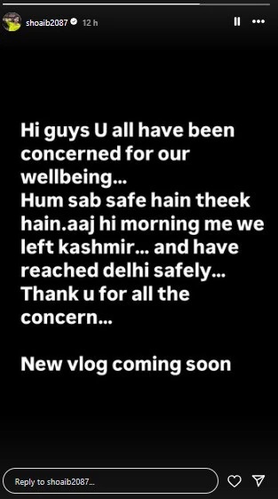 ਸ਼ੋਏਬ ਨੇ ਇੰਸਟਾਗ੍ਰਾਮ ਸਟੋਰੀ 'ਤੇ ਪ੍ਰਸ਼ੰਸਕਾਂ ਨੂੰ ਆਪਣੀ ਤੰਦਰੁਸਤੀ ਬਾਰੇ ਅਪਡੇਟ ਕੀਤਾ ਅਤੇ ਖੁਲਾਸਾ ਕੀਤਾ ਕਿ ਉਹ ਸੁਰੱਖਿਅਤ ਮੁੰਬਈ ਪਹੁੰਚ ਗਏ ਹਨ। ਉਨ੍ਹਾਂ ਲਿਖਿਆ, "ਹੈਲੋ ਦੋਸਤੋ, ਤੁਸੀਂ ਸਾਰੇ ਸਾਡੀ ਤੰਦਰੁਸਤੀ ਲਈ ਚਿੰਤਤ ਹੋ। ਅਸੀਂ ਸਾਰੇ ਸੁਰੱਖਿਅਤ ਹਾਂ ਠੀਕ ਹਾਂ, ਅੱਜ ਸਵੇਰੇ ਹੀ ਅਸੀਂ ਕਸ਼ਮੀਰ ਛੱਡਿਆ...ਅਤੇ ਅਸੀਂ ਸੁਰੱਖਿਅਤ ਦਿੱਲੀ ਪਹੁੰਚ ਗਏ। ਚਿੰਤਾ ਲਈ ਧੰਨਵਾਦ.. ਨਵਾਂ ਵਲੌਗ ਜਲਦੀ ਆ ਰਿਹਾ ਹੈ।"