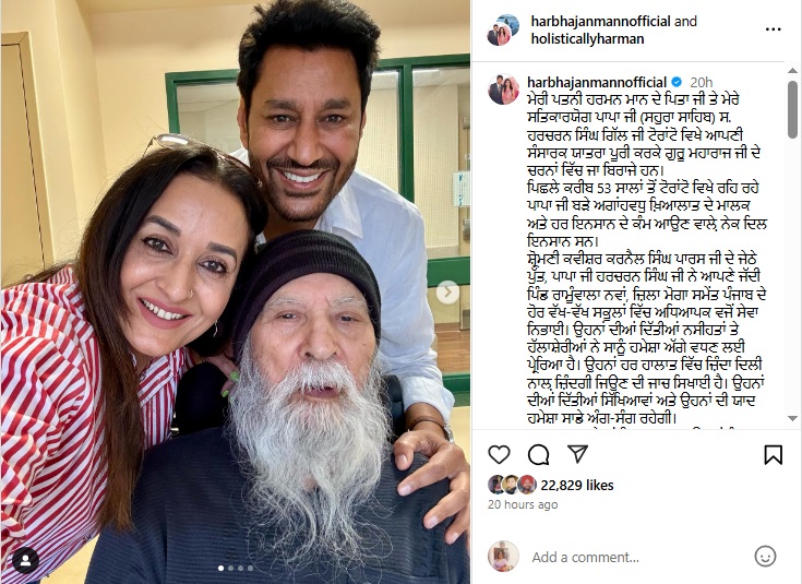 ਐਂਟਰਟੇਨਮੈਂਟ ਡੈਸਕ- ਪਾਲੀਵੁੱਡ ਇੰਡਸਟਰੀ ਤੋਂ ਇਕ ਬੁਰੀ ਖ਼ਬਰ ਸਾਹਮਣੇ ਆ ਰਹੀ ਹੈ। ਮਸ਼ਹੂਰ ਗਾਇਕ ਹਰਭਜਨ ਮਾਨ ਦੇ ਸਹੁਰੇ ਦਾ ਦਿਹਾਂਤ ਹੋ ਗਿਆ ਹੈ। ਇਸ ਦੁਖਦ ਖ਼ਬਰ ਦੀ ਜਾਣਕਾਰੀ ਖ਼ੁਦ ਗਾਇਕ ਹਰਭਜਨ ਮਾਨ ਨੇ ਆਪਣੇ ਸੋਸ਼ਲ ਮੀਡੀਆ ਅਕਾਊਂਟ 'ਤੇ ਦਿੱਤੀ। ਜਾਣਕਾਰੀ ਸਾਂਝੀ ਕਰਦੇ ਹੋਏ ਗਾਇਕ ਨੇ ਲਿਖਿਆ- 'ਮੇਰੀ ਪਤਨੀ ਹਰਮਨ ਮਾਨ ਦੇ ਪਿਤਾ ਜੀ ਤੇ ਮੇਰੇ ਸਤਿਕਾਰਯੋਗ ਪਾਪਾ ਜੀ (ਸਹੁਰਾ ਸਾਹਿਬ) ਸ. ਹਰਚਰਨ ਸਿੰਘ ਗਿੱਲ ਜੀ ਟੋਰਾਂਟੋ ਵਿਖੇ ਆਪਣੀ ਸੰਸਾਰਕ ਯਾਤਰਾ ਪੂਰੀ ਕਰਕੇ ਗੁਰੂ ਮਹਾਰਾਜ ਜੀ ਦੇ ਚਰਨਾਂ ਵਿੱਚ ਜਾ ਬਿਰਾਜੇ ਹਨ।