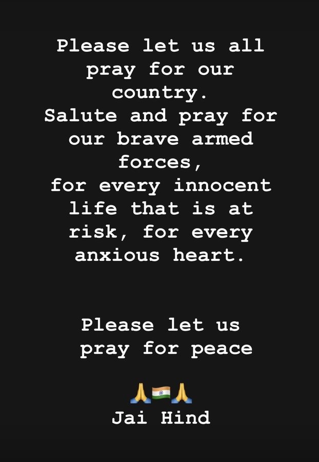 ਅਦਿਤੀ ਰਾਓ ਹੈਦਰੀ ਨੇ ਲਿਖਿਆ-"ਕਿਰਪਾ ਕਰਕੇ ਆਓ ਆਪਾਂ ਸਾਰੇ ਆਪਣੇ ਦੇਸ਼ ਲਈ ਪ੍ਰਾਰਥਨਾ ਕਰੀਏ। ਆਪਣੇ ਬਹਾਦਰ ਫੌਜੀਆਂ ਨੂੰ ਸਲਾਮ ਕਰੀਏ ਅਤੇ ਉਨ੍ਹਾਂ ਲਈ ਪ੍ਰਾਰਥਨਾ ਕਰੀਏ, ਹਰ ਉਸ ਮਾਸੂਮ ਜਾਨ ਲਈ ਜੋ ਖ਼ਤਰੇ ਵਿੱਚ ਹੈ, ਹਰ ਬੇਚੈਨ ਦਿਲ ਲਈ ਜੋ ਚਿੰਤਤ ਹੈ। ਕਿਰਪਾ ਕਰਕੇ ਸ਼ਾਂਤੀ ਲਈ ਪ੍ਰਾਰਥਨਾ ਕਰੀਏ। ਜੈ ਹਿੰਦ।" "
