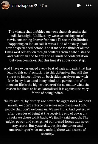 ਹਾਲ ਹੀ ਵਿੱਚ ਜਾਨ੍ਹਵੀ ਕਪੂਰ ਨੇ ਵੀ ਇੰਸਟਾਗ੍ਰਾਮ 'ਤੇ ਇੱਕ ਭਾਵੁਕ ਅਤੇ ਲੰਮਾ ਨੋਟ ਸਾਂਝਾ ਕੀਤਾ, ਜਿਸ ਵਿੱਚ ਉਨ੍ਹਾਂ ਨੇ ਦੇਸ਼ ਵਿੱਚ ਚੱਲ ਰਹੀ ਤਣਾਅਪੂਰਨ ਸਥਿਤੀ ਬਾਰੇ ਆਪਣੀ ਚਿੰਤਾ ਅਤੇ ਬੇਚੈਨੀ ਜ਼ਾਹਰ ਕੀਤੀ। ਉਨ੍ਹਾਂ ਨੇ ਲਿਖਿਆ: "ਇਹ ਇੱਕ ਅਜਿਹਾ ਤਣਾਅ ਸੀ ਜੋ ਮੈਂ ਪਹਿਲਾਂ ਕਦੇ ਮਹਿਸੂਸ ਨਹੀਂ ਕੀਤਾ ਸੀ।" "ਜਦੋਂ ਮੈਂ ਫੁਟੇਜ ਦੇਖੀ ਤਾਂ ਮੈਨੂੰ ਇੰਝ ਲੱਗਾ ਜਿਵੇਂ ਮੈਂ ਕਿਸੇ ਜੰਗੀ ਫਿਲਮ ਦਾ ਹਿੱਸਾ ਹੋਵਾਂ। ਸਭ ਕੁਝ ਅਵਿਸ਼ਵਾਸੀ ਜਿਹਾ ਜਾਪਦਾ ਸੀ।"