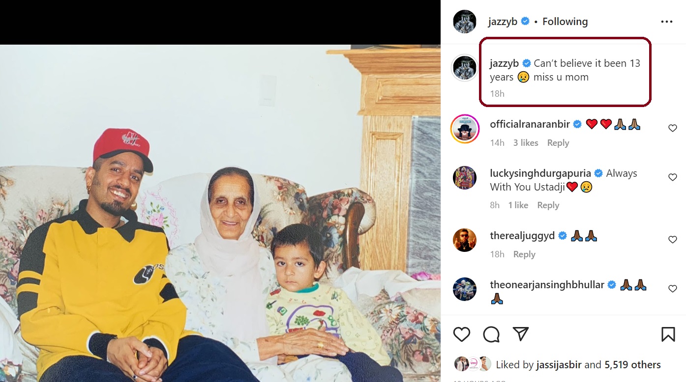 ਦਰਅਸਲ, ਬੀਤੇ ਦਿਨੀਂ ਜੈਜ਼ੀ ਬੀ ਦੀ ਮਾਂ ਦੀ 13ਵੀਂ ਬਰਸੀ ਸੀ। ਇਸ ਮੌਕੇ ਜੈਜ਼ੀ ਬੀ ਨੇ ਆਪਣੀ ਮਾਂ ਨਾਲ ਪੁਰਾਣੀ ਤਸਵੀਰ ਸੋਸ਼ਲ ਮੀਡੀਆ 'ਤੇ ਸ਼ੇਅਰ ਕੀਤੀ ਅਤੇ ਨਾਲ ਹੀ ਉਨ੍ਹਾਂ ਨੇ ਇੱਕ ਇਮੋਸ਼ਨਲ ਕੈਪਸ਼ਨ ਵੀ ਲਿਖੀ। ਜੈਜ਼ੀ ਬੀ ਨੇ ਲਿਖਿਆ, 'ਯਕੀਨ ਨਹੀਂ ਹੁੰਦਾ 13 ਸਾਲ ਹੋ ਗਏ। 😢 ਮਿਸ ਯੂ ਮੌਮ।' ਜੈਜ਼ੀ ਬੀ ਦੀ ਇਹ ਪੋਸਟ ਉਨ੍ਹਾਂ ਦੇ ਪ੍ਰਸ਼ੰਸਕਾਂ ਨੂੰ ਭਾਵੁਕ ਕਰ ਰਹੀ ਹੈ। ਫੈਨਜ਼ ਇਸ ਪੋਸਟ 'ਤੇ ਖੂਬ ਕੁਮੈਂਟ ਤੇ ਲਾਈਕ ਕਰ ਰਹੇ ਹਨ।