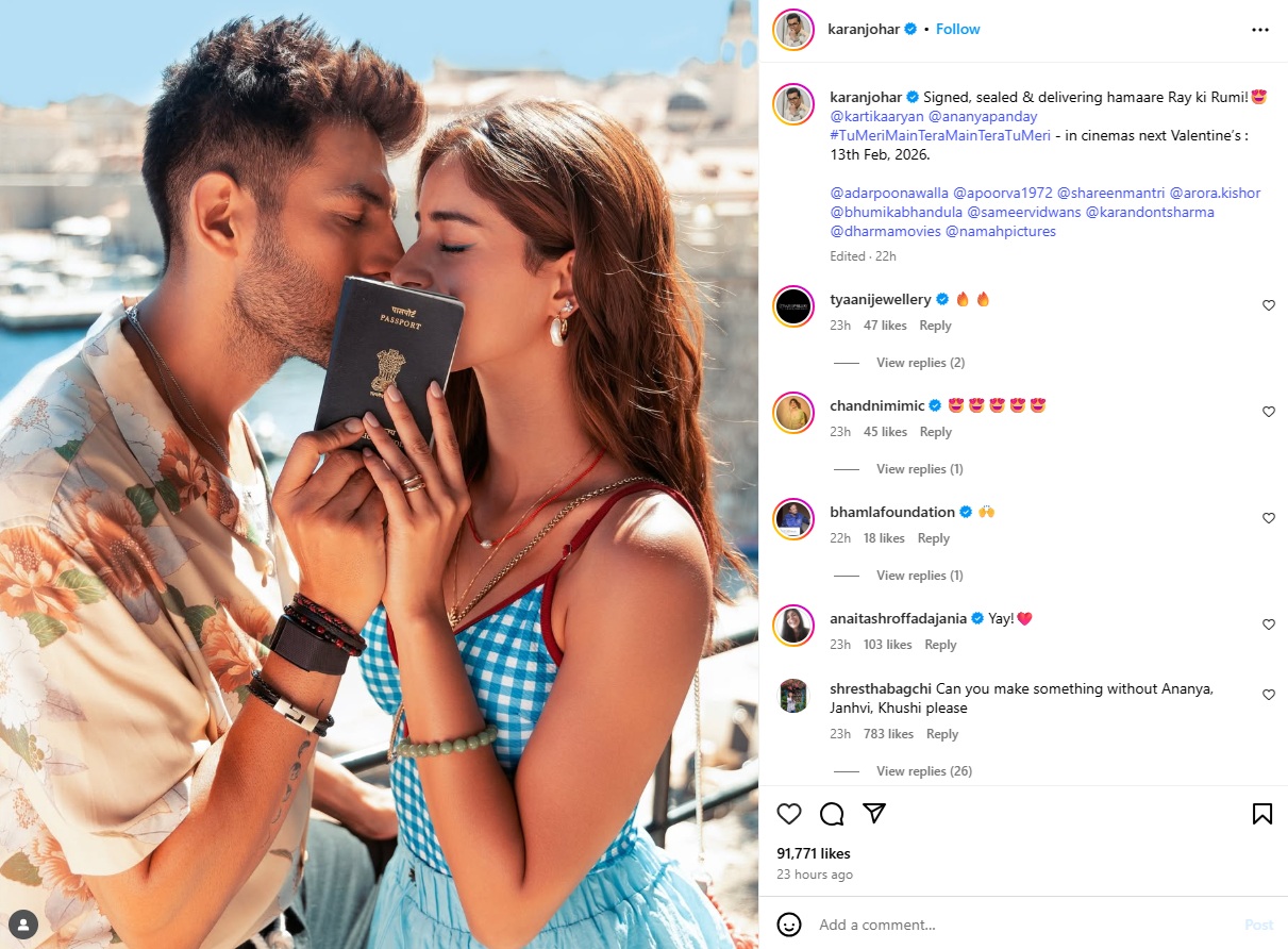 ਫਿਲਮ ਦੇ ਨਿਰਦੇਸ਼ਕ ਕਰਨ ਜੋਹਰ ਨੇ ਆਪਣੇ ਸੋਸ਼ਲ ਮੀਡੀਆ 'ਤੇ ਫਿਲਮ ਦਾ First Look Poster ਸਾਂਝਾ ਕੀਤਾ ਹੈ, ਜਿਸ 'ਚ ਕਾਰਤਿਕ ਅਤੇ ਅੰਨਨਿਆ ਇਕ-ਦੂਜੇ ਨੂੰ ਕਿਸ ਕਰਦੇ ਹੋਏ ਨਜ਼ਰ ਆ ਰਹੇ ਹਨ ਅਤੇ ਉਨ੍ਹਾਂ ਨੇ ਆਪਣੇ ਮੂੰਹ ਅੱਗੇ ਪਾਸਪੋਰਟ ਰੱਖਿਆ ਹੋਇਆ ਹੈ।
