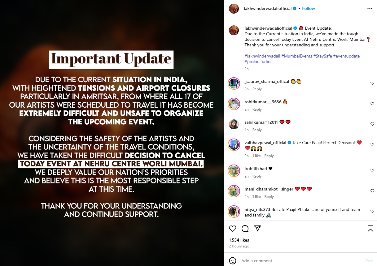 ਉਨ੍ਹਾਂ ਲਿਖਿਆ, 'ਭਾਰਤ ਵਿੱਚ ਮੌਜੂਦਾ ਸਥਿਤੀ ਦੇ ਕਾਰਨ ਵਧੇ ਹੋਏ ਤਣਾਅ ਅਤੇ ਖਾਸ ਕਰਕੇ ਅੰਮ੍ਰਿਤਸਰ ਵਿੱਚ ਹਵਾਈ ਅੱਡਾ ਬੰਦ ਹੋਣ ਕਾਰਨ, ਜਿੱਥੋਂ ਸਾਡੇ ਸਾਰੇ 17 ਕਲਾਕਾਰਾਂ ਨੇ ਉਡਾਣ ਭਰਨੀ ਸੀ, ਆਗਾਮੀ ਪ੍ਰੋਗਰਾਮ ਦਾ ਆਯੋਜਨ ਕਰਨਾ ਬਹੁਤ ਮੁਸ਼ਕਲ ਅਤੇ ਅਸੁਰੱਖਿਅਤ ਹੋ ਗਿਆ ਹੈ। ਕਲਾਕਾਰਾਂ ਦੀ ਸੁਰੱਖਿਆ ਅਤੇ ਯਾਤਰਾ ਦੀਆਂ ਸਥਿਤੀਆਂ ਦੀ ਅਨਿਸ਼ਚਿਤਤਾ ਨੂੰ ਧਿਆਨ ਵਿੱਚ ਰੱਖਦੇ ਹੋਏ, ਅਸੀਂ ਨਹਿਰੂ ਸੈਂਟਰ ਵਰਲੀ ਮੁੰਬਈ ਵਿਖੇ ਅੱਜ ਹੋਣ ਵਾਲੇ ਪ੍ਰੋਗਰਾਮ ਨੂੰ ਰੱਦ ਕਰਨ ਦਾ ਮੁਸ਼ਕਲ ਫੈਸਲਾ ਲਿਆ ਹੈ। ਅਸੀਂ ਆਪਣੇ ਦੇਸ਼ ਦੀਆਂ ਤਰਜੀਹਾਂ ਨੂੰ ਬਹੁਤ ਮਹੱਤਵ ਦਿੰਦੇ ਹਾਂ ਅਤੇ ਮੰਨਦੇ ਹਾਂ ਕਿ ਇਹ ਇਸ ਸਮੇਂ ਸਭ ਤੋਂ ਜ਼ਿੰਮੇਵਾਰ ਕਦਮ ਹੈ। ਤੁਹਾਡੀ ਸਮਝ ਅਤੇ ਨਿਰੰਤਰ ਸਮਰਥਨ ਲਈ ਧੰਨਵਾਦ।'
