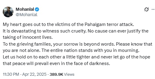 ਮੋਹਨਲਾਲ ਨੇ ਮੰਗਲਵਾਰ ਨੂੰ ਆਪਣੇ ਐਕਸ ਹੈਂਡਲ 'ਤੇ ਪਹਿਲਗਾਮ ਅੱਤਵਾਦੀ ਹਮਲੇ 'ਤੇ ਆਪਣੀ ਨਾਰਾਜ਼ਗੀ ਜ਼ਾਹਰ ਕੀਤੀ ਅਤੇ ਲਿਖਿਆ, 'ਪਹਿਲਗਾਮ ਅੱਤਵਾਦੀ ਹਮਲੇ ਦੇ ਪੀੜਤਾਂ ਪ੍ਰਤੀ ਮੇਰੀ ਸੰਵੇਦਨਾ। ਅਜਿਹੀ ਬੇਰਹਿਮੀ ਨੂੰ ਦੇਖਣਾ ਬਹੁਤ ਹੀ ਭਿਆਨਕ ਹੈ। ਕੋਈ ਵੀ ਕਾਰਨ ਮਾਸੂਮ ਲੋਕਾਂ ਦੀਆਂ ਜਾਨਾਂ ਲੈਣ ਨੂੰ ਜਾਇਜ਼ ਨਹੀਂ ਠਹਿਰਾ ਸਕਦਾ।