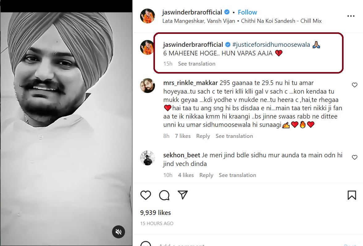 ਦੱਸਣਯੋਗ ਹੈ ਕਿ ਵੀਡੀਓ 'ਚ ਜਸਵਿੰਦਰ ਬਰਾੜ ਨੇ ਸਿੱਧੂ ਮੂਸੇਵਾਲਾ ਦੀ ਬਚਪਨ ਤੋਂ ਲੈ ਕੇ ਵੱਡੇ ਹੋਣ ਤੱਕ ਦੀਆਂ ਕਈ ਤਸਵੀਰਾਂ ਸ਼ੇਅਰ ਕੀਤੀਆਂ ਹਨ। ਇਸ ਦੇ ਨਾਲ ਬੈਕਗਰਾਊਂਡ 'ਚ ਲਤਾ ਮੰਗੇਸ਼ਕਰ ਦਾ ਸੈਡ ਸੌਂਗ 'ਚਿੱਠੀ ਨਾ ਕੋਈ ਸੰਦੇਸ਼ ਜਾਨੇ ਵੋ ਕੌਨ ਸਾ ਦੇਸ਼' ਚੱਲਦਾ ਹੈ, ਜੋ ਸਿੱਧੂ ਦੀ ਹੋਰ ਯਾਦ ਦਿਵਾਉਂਦਾ ਹੈ ਤੇ ਹਰ ਇਕ ਦੀ ਅੱਖ ਨਮ ਕਰ ਰਿਹਾ ਹੈ। ਇਸ ਵੀਡੀਓ ਨੂੰ ਸ਼ੇਅਰ ਕਰਦਿਆਂ ਜਸਵਿੰਦਰ ਬਰਾੜ ਨੇ ਕੈਪਸ਼ਨ 'ਚ ਲਿਖਿਆ, ''ਜਸਟਿਸ ਫਾਰ ਸਿੱਧੂ ਮੂਸੇਵਾਲਾ। 6 ਮਹੀਨੇ ਹੋ ਗਏ ਸਿੱਧੂ ਹੁਣ ਵਾਪਸ ਆਜਾ।'' ਇਸ ਵੀਡੀਓ ਨੂੰ ਵੇਖ ਕੇ ਸਿੱਧੂ ਮੂਸੇਵਾਲਾ ਦੇ ਫੈਨਜ਼ ਕਾਫ਼ੀ ਭਾਵੁਕ ਹੋ ਰਹੇ ਹਨ। ਜਸਵਿੰਦਰ ਬਰਾੜ ਦੇ ਇਸ ਵੀਡੀਓ 'ਤੇ ਹਜ਼ਾਰਾਂ ਲਾਈਕਸ ਤੇ ਕੁਮੈਂਟਸ ਆ ਰਹੇ ਹਨ ਅਤੇ ਨਾਲ ਹੀ ਉਸ ਦੇ ਲਈ ਇਨਸਾਫ਼ ਦੀ ਮੰਗ ਕਰ ਰਹੇ ਹਨ।