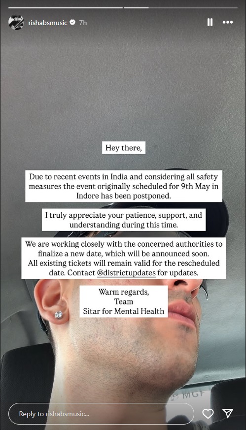 ਰਿਸ਼ਭ ਨੇ ਪੋਸਟ ਕਰ ਲਿਖਿਆ, "ਨਮਸਤੇ, ਭਾਰਤ ਵਿੱਚ ਹਾਲੀਆ ਘਟਨਾਵਾਂ ਅਤੇ ਸਾਰੇ ਸੁਰੱਖਿਆ ਉਪਾਵਾਂ ਨੂੰ ਧਿਆਨ ਵਿੱਚ ਰੱਖਦੇ ਹੋਏ 9 ਮਈ ਨੂੰ ਇੰਦੌਰ ਵਿੱਚ ਹੋਣ ਵਾਲਾ ਪ੍ਰੋਗਰਾਮ ਮੁਲਤਵੀ ਕਰ ਦਿੱਤਾ ਗਿਆ ਹੈ। ਮੈਂ ਇਸ ਸਮੇਂ ਦੌਰਾਨ ਤੁਹਾਡੇ ਸਬਰ, ਸਮਰਥਨ ਅਤੇ ਸਮਝ ਦੀ ਸੱਚਮੁੱਚ ਕਦਰ ਕਰਦਾ ਹਾਂ। ਅਸੀਂ ਇੱਕ ਨਵੀਂ ਤਾਰੀਖ ਨੂੰ ਅੰਤਿਮ ਰੂਪ ਦੇਣ ਲਈ ਸਬੰਧਤ ਅਧਿਕਾਰੀਆਂ ਨਾਲ ਮਿਲ ਕੇ ਕੰਮ ਕਰ ਰਹੇ ਹਾਂ, ਜਿਸਦਾ ਐਲਾਨ ਜਲਦੀ ਹੀ ਕੀਤਾ ਜਾਵੇਗਾ। ਸਾਰੀਆਂ ਮੌਜੂਦਾ ਟਿਕਟਾਂ ਮੁੜ ਨਿਰਧਾਰਤ ਤਾਰੀਖ ਲਈ ਵੈਧ ਰਹਿਣਗੀਆਂ। ਅਪਡੇਟ ਲਈ ਡਿਸਟਿਕ ਅਪਡੇਟਸ ਨਾਲ ਸੰਪਰਕ ਕਰੋ।"