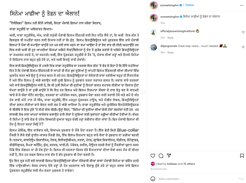 ਚੰਡੀਗੜ੍ਹ (ਬਿਊਰੋ)– ਅਸੀਂ ਸਾਗਾ ਸਟੂਡੀਓਜ਼ ਅੱਜ ਸਾਡੀ ਸਮੁੱਚੀ ਪੰਜਾਬੀ ਫ਼ਿਲਮ ਇੰਡਟਰੀ ਲਈ ਇਹ ਸਟੈਂਡ ਲੈਂਦੇ ਹਾਂ ਕਿ ਅਸੀਂ ਇਸ ਗੱਲ ’ਤੇ ਬਿਲਕੁਲ ਵੀ ਸਮਝੌਤਾ ਕਰਨ ਲਈ ਤਿਆਰ ਨਹੀਂ ਹਾਂ ਕਿ ਕੁਝ ਫ਼ਿਲਮ ਡਿਸਟ੍ਰੀਬਿਊਟਰ ਤੇ ਪ੍ਰਦਰਸ਼ਕ ਇਕ ਪਾਸੇ ਪੰਜਾਬੀ ਫ਼ਿਲਮਾਂ ਤੋਂ ਪੈਸਾ ਵੀ ਕਮਾਉਣਾ ਚਾਹੁੰਦੇ ਹਨ ਪਰ ਜਦੋਂ ਨਾਲ ਖੜ੍ਹਨ ਦਾ ਸਮਾਂ ਆਉਂਦਾ ਹੈ ਤਾਂ ਭੇਦਭਾਵ ਦੀ ਨੀਤੀ ਅਪਣਾਉਂਦੇ ਹਨ, ਇਸ ਲਈ ਅਸੀਂ ਵੀ ਹੁਣ ਆਪਣੀਆਂ ਫ਼ਿਲਮਾਂ ਅਜਿਹੇ ਲੋਕਾਂ/ਥਿਏਟਰਾਂ ਨੂੰ ਦੇਣ ਤੋਂ ਗੁਰੇਜ਼ ਕਰਾਂਗੇ, ਜੋ ਅਜਿਹੇ ਡਿਸਟ੍ਰੀਬਿਊਟਰਾਂ ਦਾ ਸਮਰਥਨ ਕਰਦੇ ਨੇ ਜਾਂ ਕਰਨਗੇ। ਅਸੀਂ ਇਕ ਪ੍ਰੋਡਕਸ਼ਨ ਸਟੂਡੀਓ ਦੇ ਤੌਰ ’ਤੇ ਪੰਜਾਬ ਦੀਆਂ ਜੜ੍ਹਾਂ ਤੇ ਇਸ ਦੇ ਸਿਨੇਮਾ ਦੇ ਇਤਿਹਾਸ ਨਾਲ ਬਹੁਤ ਜੁੜੇ ਹੋਏ ਹਾਂ ਤੇ ਅਸੀਂ ਇਸ ਨੂੰ ਜਾਰੀ ਰੱਖਾਂਗੇ।