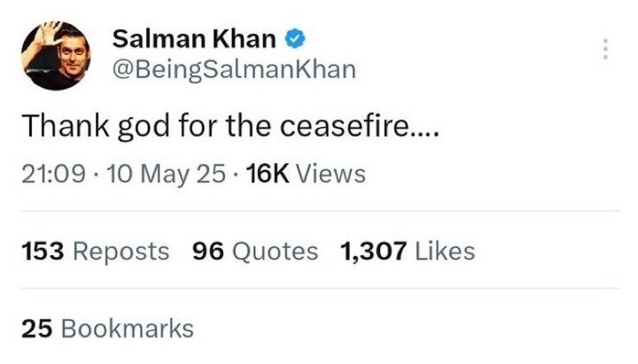 ਇਸ ਸੂਚੀ ਵਿੱਚ ਸਲਮਾਨ ਖਾਨ ਦਾ ਨਾਮ ਵੀ ਸ਼ਾਮਲ ਹੈ, ਹਾਲਾਂਕਿ ਜੰਗਬੰਦੀ ਤੋਂ ਬਾਅਦ ਅਦਾਕਾਰ ਦਾ ਇੱਕ ਟਵੀਟ ਸਾਹਮਣੇ ਆਇਆ ਜਿਸ ਵਿੱਚ ਉਨ੍ਹਾਂ ਨੇ ਕਿਹਾ, 'ਰੱਬ ਦਾ ਸ਼ੁਕਰ ਹੈ ਕਿ ਜੰਗਬੰਦੀ ਹੋਈ', ਪਰ ਇਹ ਟਵੀਟ ਕਰਨ ਤੋਂ ਤੁਰੰਤ ਬਾਅਦ ਸਲਮਾਨ ਖਾਨ ਨੇ ਇਹ ਟਵੀਟ ਡਿਲੀਟ ਕਰ ਦਿੱਤਾ। ਹੁਣ ਇਸ ਸਭ ਦੇ ਵਿਚਕਾਰ ਸਲਮਾਨ ਖਾਨ ਦਾ ਇੱਕ ਪੁਰਾਣਾ ਵੀਡੀਓ ਵਾਇਰਲ ਹੋ ਰਿਹਾ ਹੈ।