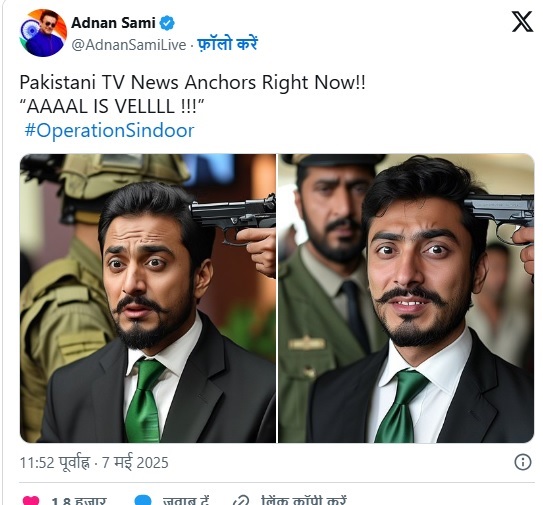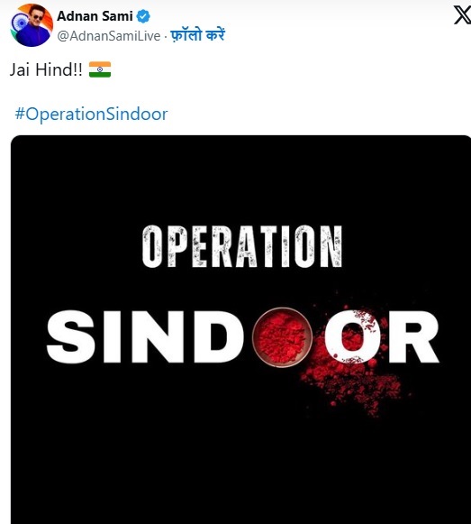 ਅਦਨਾਨ ਸਾਮੀ ਨੇ ਆਪ੍ਰੇਸ਼ਨ ਸਿੰਦੂਰ ਦਾ ਪੋਸਟਰ ਸਾਂਝਾ ਕੀਤਾ ਅਤੇ ਲਿਖਿਆ- 'ਜੈ ਹਿੰਦ'। ਨਾਲ ਹੀ ਤਿਰੰਗੇ ਵਾਲਾ ਇਮੋਜੀ ਵੀ ਪੋਸਟ ਕੀਤਾ ਹੈ।