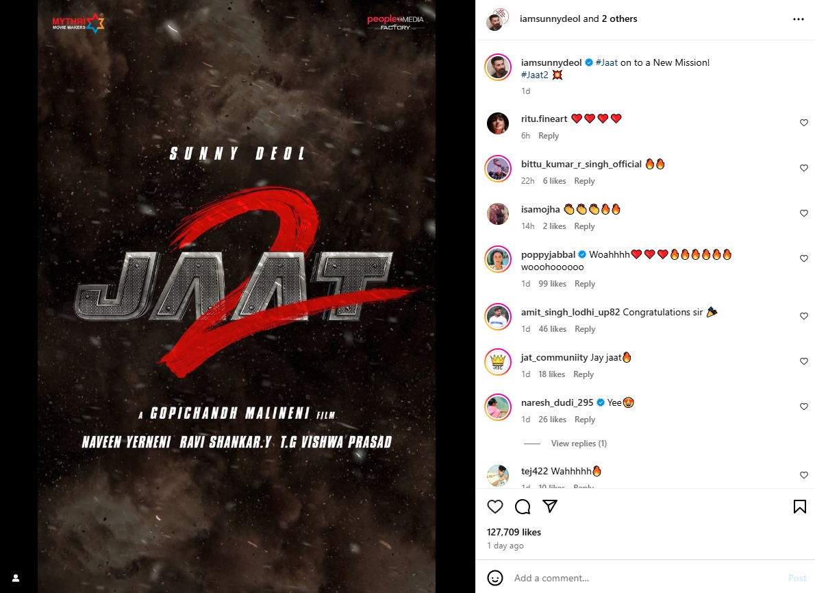 ਜਾਟ ਦਾ ਨਿਰਦੇਸ਼ਨ ਗੋਪੀਚੰਦ ਮਾਲੀਨੇਨੀ ਦੁਆਰਾ ਕੀਤਾ ਗਿਆ ਹੈ ਅਤੇ ਇਹ ਮਿਥਰੀ ਮੂਵੀ ਮੇਕਰਸ ਅਤੇ ਪੀਪਲ ਮੀਡੀਆ ਫੈਕਟਰੀ ਦੇ ਸਹਿਯੋਗ ਨਾਲ ਤਿਆਰ ਕੀਤਾ ਗਿਆ ਹੈ। ਸੰਨੀ ਦਿਓਲ ਹੁਣ ਜਾਟ ਦੇ ਸੀਕਵਲ ਵਿੱਚ ਵੀ ਨਜ਼ਰ ਆਉਣਗੇ। ਇਹ ਫਿਲਮ ਵੀ ਮਿਥਰੀ ਮੂਵੀ ਮੇਕਰਸ ਅਤੇ ਪੀਪਲ ਮੀਡੀਆ ਫੈਕਟਰੀ ਦੇ ਬੈਨਰ ਹੇਠ ਬਣਾਈ ਜਾਵੇਗੀ ਅਤੇ ਗੋਪੀਚੰਦ ਮਾਲੀਨੇਨੀ ਇਸਦਾ ਨਿਰਦੇਸ਼ਨ ਕਰਨਗੇ। ਸੰਨੀ ਦਿਓਲ ਨੇ ਇੰਸਟਾਗ੍ਰਾਮ 'ਤੇ 'ਜਾਟ 2' ਦਾ ਪੋਸਟਰ ਸਾਂਝਾ ਕੀਤਾ ਅਤੇ ਕੈਪਸ਼ਨ ਵਿੱਚ ਲਿਖਿਆ, ਜਾਟ ਇੱਕ ਨਵੇਂ ਮਿਸ਼ਨ 'ਤੇ।