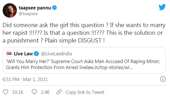 ਜੱਜ ਦੇ ਇਸ ਕੁਮੈਂਟ ’ਤੇ ਪ੍ਰਤੀਕਿਰਿਆ ਦਿੰਦੇ ਹੋਏ ਤਾਪਸੀ ਨੇ ਲਿਖਿਆ ਕਿ ਕੀ ਕਿਸੇ ਨੇ ਲੜਕੀ ਤੋਂ ਇਹ ਸਵਾਲ ਪੁੱਛਿਆ? ਕਿ ਕੀ ਉਹ ਰੇਪਈਸਟ ਨਾਲ ਵਿਆਹ ਕਰਨਾ ਚਾਹੁੰਦੀ ਹੈ ਜਾਂ ਨਹੀਂ? ਕੀ ਇਹ ਸਵਾਲ ਹੈ? ਇਹ ਹੱਲ ਹੈ ਜਾਂ ਸਜ਼ਾ? ਇਕਦਮ ਘਟੀਆ’।