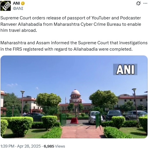 ਐਂਟਰਟੇਨਮੈਂਟ ਡੈਸਕ- ਮਸ਼ਹੂਰ ਯੂਟਿਊਬਰ ਰਣਵੀਰ ਅੱਲਾਹਬਾਦੀਆ 'ਇੰਡੀਆਜ਼ ਗੌਟ ਲੇਟੈਂਟ' 'ਤੇ ਆਪਣੀਆਂ ਅਸ਼ਲੀਲ ਟਿੱਪਣੀਆਂ ਕਾਰਨ ਕਾਫ਼ੀ ਸਮੇਂ ਤੋਂ ਵਿਵਾਦਾਂ ਵਿੱਚ ਹਨ। ਉਨ੍ਹਾਂ ਨੇ ਆਪਣਾ ਪਾਸਪੋਰਟ ਜਾਰੀ ਕਰਨ ਲਈ ਸੁਪਰੀਮ ਕੋਰਟ ਵਿੱਚ ਪਟੀਸ਼ਨ ਦਾਇਰ ਕੀਤੀ ਸੀ। ਅੱਜ ਯਾਨੀ 28 ਅਪ੍ਰੈਲ ਨੂੰ ਅਦਾਲਤ ਨੇ ਇਸ ਮਾਮਲੇ ਵਿੱਚ ਆਪਣਾ ਫੈਸਲਾ ਸੁਣਾਇਆ ਅਤੇ ਰਣਵੀਰ ਨੇ ਸੁੱਖ ਦਾ ਸਾਹ ਲਿਆ ਹੈ। ਦਰਅਸਲ 'ਇੰਡੀਆਜ਼ ਗੌਟ ਲੇਟੈਂਟ' ਵਿਵਾਦ ਦੇ ਵਿਚਕਾਰ ਸੁਪਰੀਮ ਕੋਰਟ ਨੇ ਰਣਵੀਰ ਦਾ ਪਾਸਪੋਰਟ ਜਾਰੀ ਕਰਨ ਦਾ ਹੁਕਮ ਦਿੱਤਾ ਹੈ।