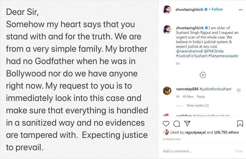 ਸੁਸ਼ਾਂਤ ਦੀ ਭੈਣ ਸ਼ਵੇਤਾ ਨੇ ਇੰਸਟਾਗ੍ਰਾਮ 'ਤੇ ਇੱਕ ਪੋਸਟ ਸਾਂਝੀ ਕਰਦੇ ਹੋਏ ਪੀ. ਐੱਮ. ਮੋਦੀ ਨੂੰ ਅਪੀਲ ਕੀਤੀ ਹੈ ਕਿ ਮਾਮਲੇ ਨੂੰ ਧਿਆਨ 'ਚ ਲਿਆਂਦਾ ਜਾਵੇ। ਉਨ੍ਹਾਂ ਨੇ ਲਿਖਿਆ, 'ਮੇਰਾ ਭਰਾ ਦਾ ਫ਼ਿਲਮ ਉਦਯੋਗ 'ਚ ਕੋਈ ਗੋਡ ਫਾਦਰ ਨਹੀਂ ਸੀ। ਅਸੀਂ ਬਹੁਤ ਸਾਧਾਰਨ ਪਰਿਵਾਰ 'ਚੋਂ ਹਾਂ। ਸਿਰਫ਼ ਮੇਰਾ ਭਰਾ ਇਕਲੌਤਾ ਸਟਾਰ ਬਾਲੀਵੁੱਡ 'ਚ ਸਾਡੇ ਪਰਿਵਾਰ 'ਚੋਂ ਸੀ। ਤੁਹਾਨੂੰ ਬੇਨਤੀ ਹੈ ਕਿ ਇਸ ਮਾਮਲੇ 'ਤੇ ਧਿਆਨ ਦੇਵੋ। ਸੁਸ਼ਾਂਤ ਮਾਮਲੇ 'ਚ ਸੱਚ ਬਾਹਰ ਆਏ ਤੇ ਸਬੂਤਾਂ ਨਾਲ ਛੇੜਛਾੜ ਨਾ ਕੀਤੀ ਜਾਵੇ।' ਇਸ ਪੋਸਟ ਨੂੰ ਉਨ੍ਹਾਂ ਨੇ ਪੀ. ਐੱਮ. ਮੋਦੀ ਤੇ ਪੀ. ਐੱਮ. ਓ ਇੰਡੀਆ ਨੂੰ ਟੈਗ ਕੀਤਾ ਹੈ।