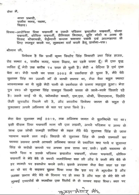 ਪਟਨਾ (ਬਿਊਰੋ) : ਬਾਲੀਵੁੱਡ ਅਦਾਕਾਰ ਸੁਸ਼ਾਂਤ ਸਿੰਘ ਰਾਜਪੂਤ ਦੇ ਖ਼ੁਦਕੁਸ਼ੀ ਮਾਮਲੇ 'ਚ ਨਵਾਂ ਮੋੜ ਆ ਗਿਆ ਹੈ। ਦਰਅਸਲ ਸੁਸ਼ਾਂਤ ਦੇ ਪਿਤਾ ਨੇ ਆਪਣੀ ਸ਼ਿਕਾਇਤ 'ਚ ਰਿਆ ਚੱਕਰਵਰਤੀ ਦੇ ਭਰਾ ਅਤੇ ਪਰਿਵਾਰ 'ਤੇ ਦੋਸ਼ ਲਾਇਆ ਕਿ ਪੂਰਾ ਪਰਿਵਾਰ ਮਿਲ ਕੇ ਸੁਸ਼ਾਂਤ ਦੇ ਪੈਸੇ ਲੁੱਟ ਰਿਹਾ ਸੀ। ਉਨ੍ਹਾਂ ਨੇ ਬਹੁਤ ਸਾਰੇ ਸਨਸਨੀਖੇਜ਼ ਦੋਸ਼ ਲਾਏ ਹਨ। ਉਨ੍ਹਾਂ ਨੇ ਐੱਸ. ਆਈ. ਟੀ. ਦੁਆਰਾ ਐੱਫ. ਆਈ. ਆਰ. 'ਚ ਸੱਤ ਪਹਿਲੂਆਂ ਦੀ ਕੁੱਲ ਜਾਂਚ ਦੀ ਮੰਗ ਕੀਤੀ ਹੈ।