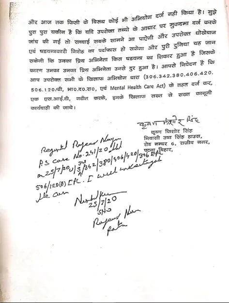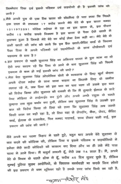 ਸੁਸ਼ਾਂਤ ਸਿੰਘ ਰਾਜਪੂਤ ਨੂੰ ਪਾਗਲ ਘੋਸ਼ਿਤ ਕਰਨ ਲਈ ਤਿਆਰ ਸੀ। ਸੁਸ਼ਾਂਤ ਦੇ ਪਿਤਾ ਨੇ ਆਪਣੀ ਸ਼ਿਕਾਇਤ 'ਚ ਦੱਸਿਆ ਕਿ ਉਹ ਬਜ਼ੁਰਗ ਹੈ ਅਤੇ ਜ਼ਿਆਦਾ ਦੌੜ-ਭੱਜ ਨਹੀਂ ਕਰ ਸਕਦਾ। ਇਸ ਲਈ ਉਸਨੇ ਇਹ ਸ਼ਿਕਾਇਤ ਹੁਣ ਪਟਨਾ 'ਚ ਦਿੱਤੀ ਹੈ।