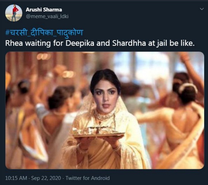 ਫ਼ਿਲਮ 'ਕਭੀ ਖੁਸ਼ੀ ਕਭੀ ਗਮ' 'ਤੇ ਬਣਾਇਆ ਮੀਮਸ ਸਾਂਝਾ ਕਰਕੇ ਲਿਖਿਆ, 'ਰੀਆ ਚੱਕਰਵਰਤੀ ਜੇਲ 'ਚ ਦੀਪਿਕਾ ਤੇ ਸ਼ਰਧਾ ਕਪੂਰ ਦਾ ਇੰਤਜ਼ਾਰ ਕਰਦੇ ਹੋਏ।'