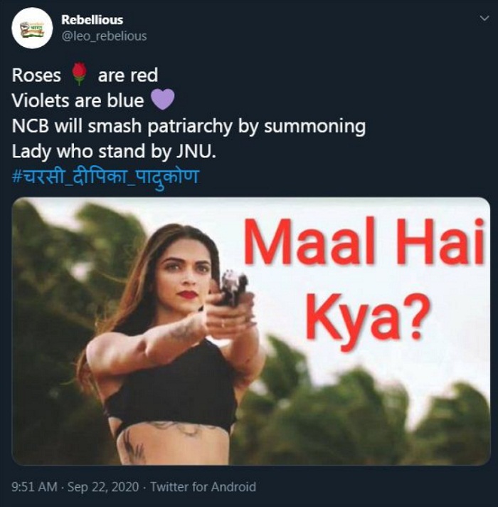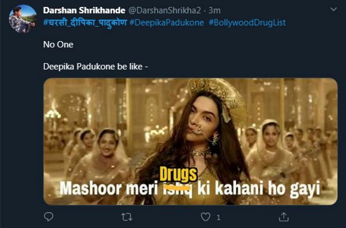 ਇਸ ਯੂਜ਼ਰ ਨੇ ਫ਼ਿਲਮ 'ਬਾਜੀਰਾਵ ਮਸਤਾਨੀ' 'ਚ ਦੀਪਿਕਾ ਦੇ ਗੀਤ ਦੇ ਬੋਲ ਬਦਲ ਕੇ ਲਿਖਿਆ, 'ਮਸ਼ਹੂਰ ਮੇਰੇ ਡਰੱਗ ਦੀ ਕਹਾਣੀ ਹੋ ਗਈ।'