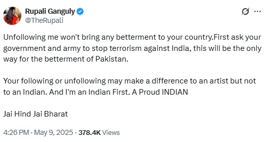 ਰੂਪਾਲੀ ਗਾਂਗੁਲੀ ਨੇ ਆਪਣੀ ਟਵਿੱਟਰ ਅਤੇ ਇੰਸਟਾਗ੍ਰਾਮ ਸਟੋਰੀ 'ਤੇ ਇੱਕ ਪੋਸਟ ਸਾਂਝੀ ਕੀਤੀ, ਜਿਸ ਵਿੱਚ ਉਨ੍ਹਾਂ ਨੇ ਲਿਖਿਆ, 'ਮੈਨੂੰ ਅਨਫਾਲੋ ਕਰਨ ਨਾਲ ਤੁਹਾਡੇ ਦੇਸ਼ ਵਿੱਚ ਕੋਈ ਸੁਧਾਰ ਨਹੀਂ ਆਵੇਗਾ।' ਪਹਿਲਾਂ ਆਪਣੀ ਸਰਕਾਰ ਅਤੇ ਫੌਜ ਨੂੰ ਭਾਰਤ ਵਿਰੁੱਧ ਅੱਤਵਾਦ ਰੋਕਣ ਲਈ ਕਹੋ, ਇਹ ਪਾਕਿਸਤਾਨ ਦੀ ਬਿਹਤਰੀ ਦਾ ਇੱਕੋ ਇੱਕ ਰਸਤਾ ਹੋਵੇਗਾ।