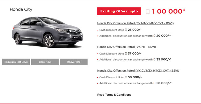 ਹੋਂਡਾ ਦੀ ਇਸ ਪ੍ਰਸਿੱਧ ਕਾਰ ’ਤੇ 1 ਲੱਖ ਰੁਪਏ ਤਕ ਦੀ ਛੋਟ ਪਾ ਸਕਦੇ ਹੋ। ਹੋਂਡਾ ਸਿਟੀ ਪੈਟਰੋਲ ਦੇ SV MT, V MT ਅਤੇ V CVT ਮਾਡਲ ’ਤੇ 45 ਹਜ਼ਾਰ ਰੁਪਏ ਤਕ ਦੀ ਛੋਟ ਮਿਲ ਰਹੀ ਹੈ। ਇਸ ਵਿਚ 25 ਹਜ਼ਾਰ ਰੁਪਏ ਦਾ ਕੈਸ਼ ਡਿਸਕਾਊਂਟ ਅਤੇ 20 ਹਜ਼ਾਰ ਰੁਪਏ ਐਕਸਚੇਂਜ ਬੋਨਸ ਸ਼ਾਮਲ ਹਨ। ਸਿਟੀ ਪੈਟਰੋਲ ਦੇ VX MT ਮਾਡਲ ’ਤੇ 72 ਹਜ਼ਾਰ ਰੁਪਏ ਤਕ ਦੀ ਛੋਟ ਪਾ ਸਕਦੇ ਹੋ, ਜਿਸ ਵਿਚ 37 ਹਜ਼ਾਰ ਰੁਪਏ ਦਾ ਕੈਸ਼ ਡਿਸਕਾਊਂਟ ਅਤੇ 35 ਹਜ਼ਾਰ ਰੁਪਏ ਦਾ ਐਕਸਚੇਂਜ ਬੋਨਸ ਸ਼ਾਮਲ ਹਨ। ਉਥੇ ਹੀ ਕਾਰ ਦੇ VX CVT, ZX MT ਅਤੇ ZX CVT ਮਾਡਲਾਂ ’ਤੇ 1 ਲੱਖ ਰੁਪਏ ਤਕ ਦੇ ਫਾਇਦੇ ਪਾ ਸਕਦੇ ਹੋ। ਇਸ ਵਿਚ 50 ਹਜ਼ਾਰ ਰੁਪਏ ਤਕ ਕੈਸ਼ ਡਿਸਕਾਊਂਟ ਅਤੇ 50 ਹਜ਼ਾਰ ਰੁਪਏ ਐਕਸਚੇਂਜ ਬੋਨਸ ਸ਼ਾਮਲ ਹਨ। ਹੋਂਡਾ ਸਿਟੀ ਦੀ ਕੀਮਤ 9.91 ਲੱਖ ਰੁਪਏ ਤੋਂ ਸ਼ੁਰੂ ਹੁੰਦੀ ਹੈ।
