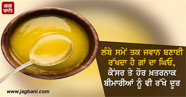 ਨਵੀਂ ਦਿੱਲੀ (ਬਿਊਰੋ)- ਜੇਕਰ ਤੁਸੀਂ ਇਹ ਸੋਚ ਕੇ ਗਾਂ ਦੇ ਦੇਸੀ ਘਿਓ ਤੋਂ ਦੂਰੀ ਬਣਾ ਕੇ ਰੱਖਦੇ ਹੋ ਕਿ ਇਹ ਤੁਹਾਡੀ ਸਿਹਤ ਲਈ ਹਾਨੀਕਾਰਕ ਹੋਵੇਗਾ ਤਾਂ ਤੁਸੀਂ ਗਲਤ ਸੋਚਦੇ ਹੋ। ਮਾਹਿਰਾਂ ਦਾ ਕਹਿਣਾ ਹੈ ਕਿ ਦੇਸੀ ਘਿਓ ਕਈ ਬੀਮਾਰੀਆਂ ਵਿੱਚ ਰਾਮਬਾਣ ਦਾ ਕੰਮ ਕਰਦਾ ਹੈ ਜੋ ਆਮ ਤੌਰ 'ਤੇ ਦਵਾਈ ਨਾਲ ਠੀਕ ਨਹੀਂ ਹੁੰਦੇ। ਗਾਂ ਦੇ ਘਿਓ ਵਿੱਚ ਕਈ ਅਜਿਹੇ ਗੁਣ ਹੁੰਦੇ ਹਨ ਜੋ ਤੁਹਾਡੇ ਸਰੀਰ ਵਿੱਚ ਪੈਦਾ ਹੋਣ ਵਾਲੀਆਂ ਕਈ ਸਮੱਸਿਆਵਾਂ ਨੂੰ ਰੋਕਦੇ ਹਨ। ਇੰਨਾ ਹੀ ਨਹੀਂ ਇਸ 'ਚ ਤੁਹਾਨੂੰ ਜਵਾਨ ਬਣਾਉਣ ਦੀ ਤਾਕਤ ਹੈ ਜੇਕਰ ਤੁਸੀਂ ਨਿਯਮਿਤ ਤੌਰ 'ਤੇ ਗਾਂ ਦੇ ਦੇਸੀ ਘਿਓ ਦੀ ਵਰਤੋਂ ਕਰਦੇ ਹੋ ਤਾਂ ਇਹ ਤੁਹਾਡੀ ਚਮੜੀ ਨੂੰ ਲੰਬੇ ਸਮੇਂ ਤਕ ਜਵਾਨ ਤੇ ਚਮਕਦਾਰ ਬਣਾਉਂਦਾ ਹੈ।
