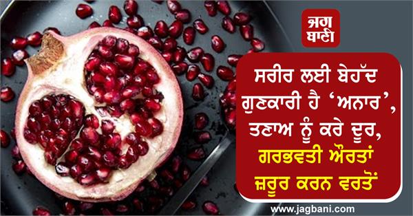 ਜੇਕਰ ਤੁਹਾਨੂੰ ਵੀ ਦਫ਼ਤਰ ਦੇ ਕੰਮ ਕਾਰਨ ਅਕਸਰ ਤਣਾਅ ਜਾਂ ਟੈਂਸ਼ਨ ਰਹਿੰਦੀ ਹੈ ਤਾਂ ਰੋਜ਼ਾਨਾ ਅਨਾਰ ਖਾਣ ਦੀ ਆਦਤ ਪਾਓ। ਇਸ ਦਾ ਸੇਵਨ ਤਣਾਅ ਘੱਟ ਕਰਨ ’ਚ ਮਦਦ ਕਰਦਾ ਹੈ।