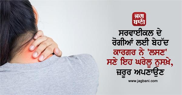 ਸਰਵਾਈਕਲ ਦੇ ਦਰਦ ਤੋਂ ਰਾਹਤ ਪਾਉਣ ਲਈ ਤੁਸੀਂ ਲਸਣ ਦਾ ਇਸਤੇਮਾਲ ਵੀ ਕਰ ਸਕਦੇ ਹੋ। ਲਸਣ ਔਸ਼ਦੀ ਗੁਣਾਂ ਨਾਲ ਰਾਹਤ ਦਿਵਾਉਣ 'ਚ ਕਾਫ਼ੀ ਮਦਦ ਕਰਦਾ ਹੈ। ਇਹ ਦਰਦ, ਸੋਜ ਅਤੇ ਜਲਨ ਵੀ ਘੱਟ ਕਰਦਾ ਹੈ। ਤੁਸੀਂ ਸਰ੍ਹੋਂ ਦੇ ਤੇਲ 'ਚ ਲਸਣ ਪਕਾ ਕੇ ਖਾ ਸਕਦੇ ਹੋ। ਇਸ ਤੋਂ ਇਲਾਵਾ ਤੁਸੀਂ ਪਕਿਆ ਹੋਇਆ ਲਸਣ ਵੀ ਖਾ ਸਕਦੇ ਹੋ। ਤੁਸੀਂ ਲਸਣ ਨਾਲ ਤਿਆਰ ਤੇਲ ਨਾਲ ਵੀ ਦਰਦ ਵਾਲੀ ਥਾਂ 'ਤੇ ਮਾਲਿਸ਼ ਕਰ ਸਕਦੇ ਹੋ। ਹੌਲੀ-ਹੌਲੀ ਹੱਥਾਂ ਨਾਲ ਮਾਲਿਸ਼ ਕਰੋ। ਤੁਹਾਨੂੰ ਦਰਦ ਤੋਂ ਕਾਫ਼ੀ ਰਾਹਤ ਮਿਲੇਗੀ।
