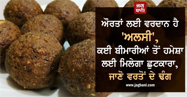 ਜਨਾਨੀਆਂ ਲਈ ਵਰਦਾਨ :- ਅਲਸੀ ਦੇ ਬੀਜ ਜਨਾਨੀਆਂ ਲਈ ਵਰਦਾਨ ਸਾਬਤ ਹੁੰਦੇ ਹਨ। ਜਨਾਨੀਆਂ ਨੂੰ ਪੀਰੀਅਡਸ ਬੰਦ ਹੋਣ ਤੋਂ ਬਾਅਦ ਕਈ ਤਰ੍ਹਾਂ ਦੀਆਂ ਸਮੱਸਿਆਵਾਂ ਹੁੰਦੀਆਂ ਹਨ। ਜੇਕਰ ਇਸ ਦੌਰਾਨ 40 ਗ੍ਰਾਮ ਪੀਸੀ ਹੋਈ ਅਲਸੀ ਦਾ ਸੇਵਨ ਕੀਤਾ ਜਾਵੇ ਤਾਂ ਇਸ ਪਰੇਸ਼ਾਨੀ 'ਚ ਕਾਫ਼ੀ ਰਾਹਤ ਮਿਲੇਗੀ।