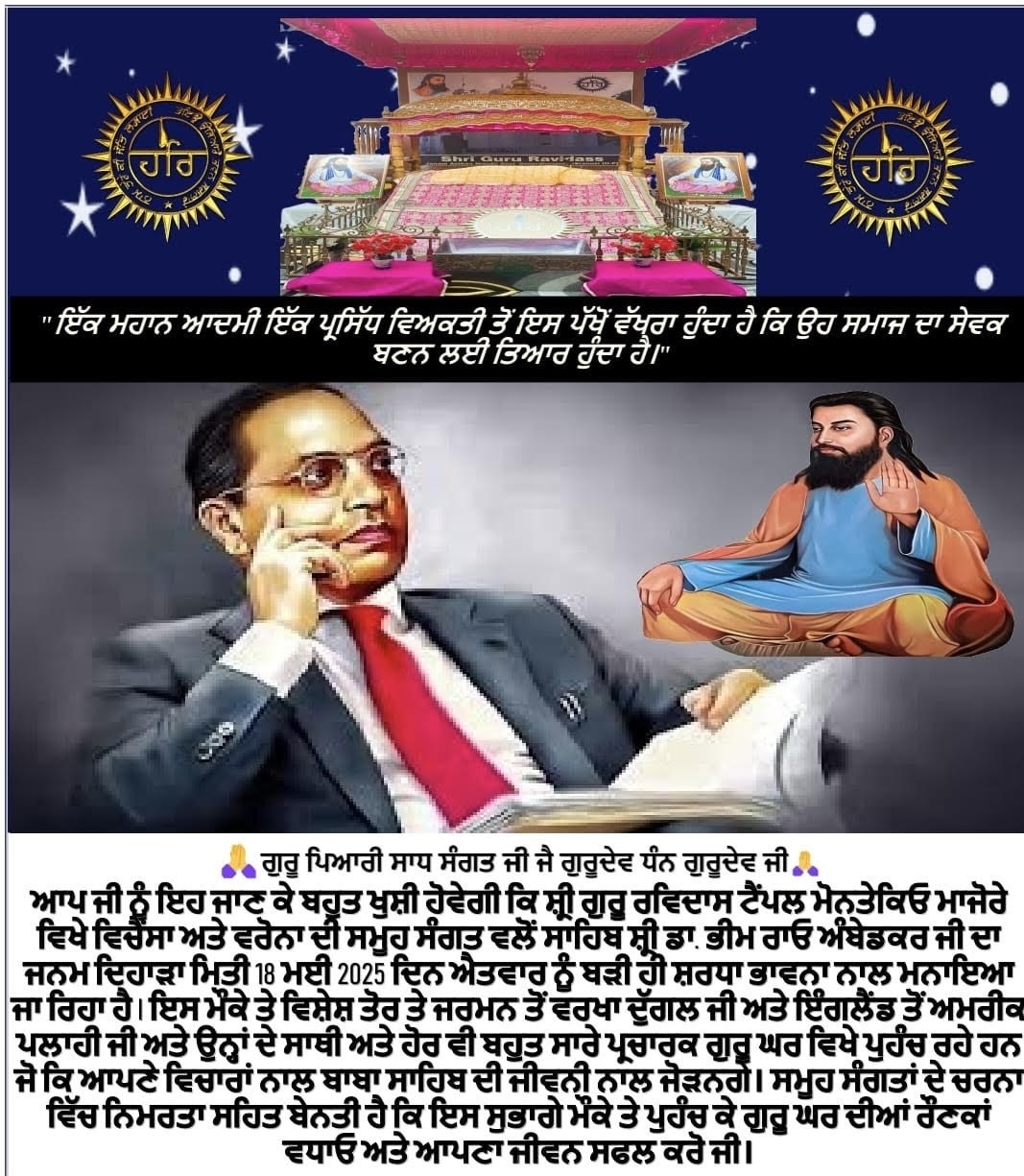 ਵਿਚੈਂਸਾ (ਕੈਂਥ) : ਭਾਰਤ ਦੀ ਰਾਜਨੀਤੀ ਦੀ ਕਾਇਆ ਤੇ ਛਾਇਆ ਭਾਰਤੀ ਸੰਵਿਧਾਨ ਨਾਲ ਬਦਲ ਕੇ ਲੋਕਤੰਤਰ ਦੀ ਸਥਾਪਨਾ ਕਰਨ ਵਾਲੇ ਭਾਰਤ ਦੇ ਮਹਾਨ ਰਾਜਨੀਤੀਵਾਨ, ਅਰਥਸ਼ਾਸ਼ਤਰੀ, ਦੁਨੀਆਂ ਦੀਆਂ 9 ਭਾਸ਼ਾਵਾਂ ਦੇ ਗਿਆਤਾ ਤੇ ਗਰੀਬਾਂ ਦੇ ਮਸੀਹਾ ਭਾਰਤ ਰਤਨ ਡਾ. ਭੀਮ ਰਾਓ ਅੰਬੇਡਕਰ ਸਾਹਿਬ ਦਾ 134ਵਾਂ ਜਨਮ ਦਿਨ ਵੈਨੇਤੋ ਸੂਬੇ ਦੇ ਪ੍ਰਸਿੱਧ ਗੁਰਦੁਆਰਾ ਸ਼੍ਰੀ ਗੁਰੂ ਰਵਿਦਾਸ ਟੈਪਲ ਮੌਨਤੈਕਿਓ (ਵਿਚੈਂਸਾ) ਵਿਖੇ ਗੁਰਦੁਆਰਾ ਪ੍ਰਬੰਧਕ ਕਮੇਟੀ ਵੱਲੋਂ ਸਮੂਹ ਸੰਗਤ ਤੇ ਅੰਬੇਕਡਰੀ ਸਾਥੀਆਂ ਦੇ ਸਹਿਯੋਗ ਨਾਲ ਬਹੁਤ ਹੀ ਉਤਸ਼ਾਹਪੂਰਵਕ 18 ਮਈ ਦਿਨ ਐਤਵਾਰ ਨੂੰ ਮਨਾਇਆ ਜਾ ਰਿਹਾ ਹੈ।