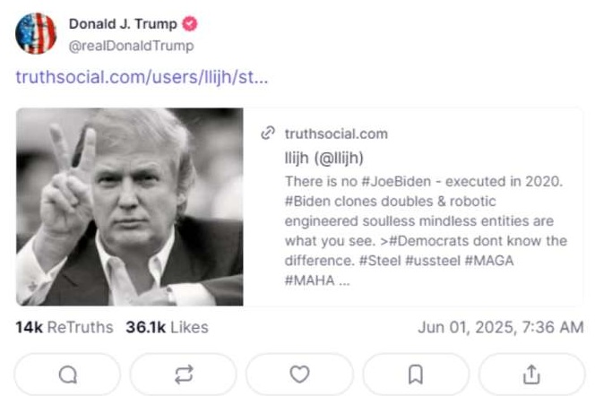 ਵਾਸ਼ਿੰਗਟਨ: ਅਮਰੀਕੀ ਰਾਸ਼ਟਰਪਤੀ ਡੋਨਾਲਡ ਟਰੰਪ ਨੇ ਇੱਕ ਵਾਰ ਫਿਰ ਹੈਰਾਨ ਕਰਨ ਵਾਲੀ ਪੋਸਟ ਸਾਂਝੀ ਕੀਤੀ ਹੈ। ਉਨ੍ਹਾਂ ਨੇ ਆਪਣੇ ਸੋਸ਼ਲ ਮੀਡੀਆ ਪਲੇਟਫਾਰਮ ਟਰੂਥ ਸੋਸ਼ਲ 'ਤੇ ਦਾਅਵਾ ਕੀਤਾ ਹੈ ਕਿ ਜੋਅ ਬਾਈਡੇਨ ਦਾ 2020 ਵਿੱਚ ਕਤਲ ਕਰ ਦਿੱਤਾ ਗਿਆ ਸੀ ਅਤੇ ਜੋ ਬਾਈਡੇਨ ਦੀ ਥਾਂ ਇਕ ਰੋਬੋਟ ਨੂੰ ਲਿਆਂਦਾ ਗਿਆ ਸੀ, ਜਿਸ ਨੇ ਬਾਈਡਨ ਦੀ ਜਗ੍ਹਾ ਲੈ ਲਈ ਹੈ। ਟਰੰਪ ਨੇ ਪੋਸਟ ਵਿਚ Conspiracy Theory ਦਾ ਹਵਾਲਾ ਦਿੰਦੇ ਹੋਏ ਲਿਖਿਆ, "ਬਾਈਡਨ ਦਾ 2020 ਵਿੱਚ ਕਤਲ ਹੋ ਚੁੱਕਾ ਹੈ। ਜੋ ਅੱਜ ਦਿਖਾਈ ਦੇ ਰਹੇ ਹਨ ਉਹ ਕਲੋਨ, ਡੁਪਲੀਕੇਟ ਜਾਂ ਰੋਬੋਟ ਹਨ। ਉਨ੍ਹਾਂ ਦੇ ਅੰਦਰ ਨਾ ਤਾਂ ਆਤਮਾ ਹੈ ਅਤੇ ਨਾ ਹੀ ਦਿਮਾਗ।" ਡੈਮੋਕ੍ਰੇਟਸ ਨੂੰ ਉਨ੍ਹਾਂ ਵਿਚਾਲੇ ਦਾ ਅੰਦਰ ਨਹੀ ਪਤਾ।