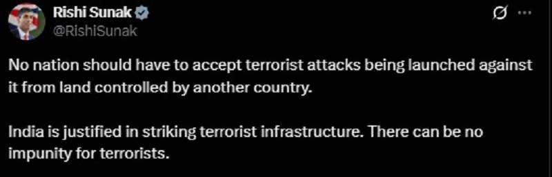 ਲੰਡਨ [ਯੂਕੇ] (ਏਐਨਆਈ): ਭਾਰਤ ਨੂੰ ਸਮਰਥਨ ਦਿੰਦੇ ਹੋਏ ਯੂ.ਕੇ ਦੇ ਸਾਬਕਾ ਪ੍ਰਧਾਨ ਮੰਤਰੀ ਰਿਸ਼ੀ ਸੁਨਕ ਨੇ ਆਪ੍ਰੇਸ਼ਨ ਸਿੰਦੂਰ ਤੋਂ ਬਾਅਦ ਸਰਹੱਦ ਪਾਰ ਅੱਤਵਾਦ ਵਿਰੁੱਧ ਨਵੀਂ ਦਿੱਲੀ ਦੀ ਕਾਰਵਾਈ ਦਾ ਜ਼ੋਰਦਾਰ ਸਮਰਥਨ ਕੀਤਾ ਅਤੇ ਕਿਹਾ ਕਿ "ਭਾਰਤ ਦਾ ਅੱਤਵਾਦੀ ਢਾਂਚੇ 'ਤੇ ਹਮਲਾ ਕਰਨਾ ਜਾਇਜ਼ ਹੈ।" ਐਕਸ 'ਤੇ ਇੱਕ ਪੋਸਟ ਸਾਂਝੀ ਕਰਦੇ ਹੋਏ ਸੁਨਕ ਨੇ ਕਿਹਾ, "ਕਿਸੇ ਵੀ ਦੇਸ਼ ਨੂੰ ਕਿਸੇ ਹੋਰ ਦੇਸ਼ ਦੁਆਰਾ ਨਿਯੰਤਰਿਤ ਜ਼ਮੀਨ ਤੋਂ ਆਪਣੇ ਵਿਰੁੱਧ ਕੀਤੇ ਜਾ ਰਹੇ ਅੱਤਵਾਦੀ ਹਮਲਿਆਂ ਨੂੰ ਸਵੀਕਾਰ ਨਹੀਂ ਕਰਨਾ ਚਾਹੀਦਾ। ਭਾਰਤ ਦਾ ਅੱਤਵਾਦੀ ਢਾਂਚੇ 'ਤੇ ਹਮਲਾ ਕਰਨਾ ਜਾਇਜ਼ ਹੈ। ਅੱਤਵਾਦੀਆਂ ਨੂੰ ਕੋਈ ਛੋਟ ਨਹੀਂ ਦਿੱਤੀ ਜਾ ਸਕਦੀ।"