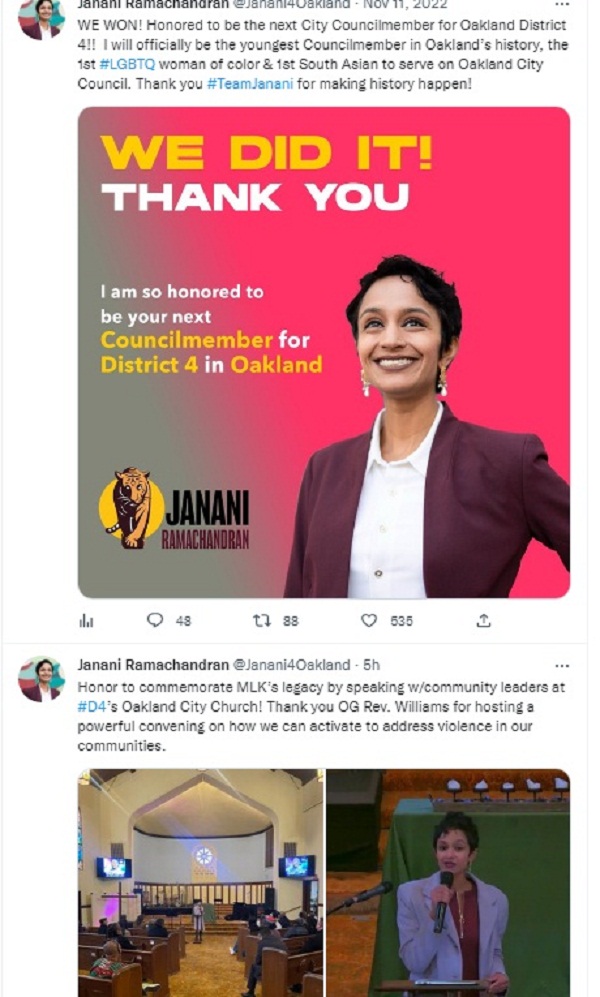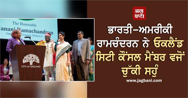 ਨਿਊਯਾਰਕ (ਆਈ.ਏ.ਐੱਨ.ਐੱਸ.)- ਭਾਰਤੀ-ਅਮਰੀਕੀ ਅਟਾਰਨੀ ਜਨਾਨੀ ਰਾਮਚੰਦਰਨ ਓਕਲੈਂਡ ਦੇ ਜ਼ਿਲ੍ਹਾ 4 ਲਈ ਸਿਟੀ ਕੌਂਸਲ ਮੈਂਬਰ ਵਜੋਂ ਸਹੁੰ ਚੁੱਕਣ ਵਾਲੀ ਸਭ ਤੋਂ ਘੱਟ ਉਮਰ ਦੀ ਅਤੇ ਪਹਿਲੀ ਗੈਰ ਗੋਰੀ ਔਰਤ ਬਣ ਗਈ ਹੈ। 30 ਸਾਲ ਦੀ ਰਾਮਚੰਦਰਨ 8 ਨਵੰਬਰ ਦੀਆਂ ਮੱਧ-ਮਿਆਦ ਦੀਆਂ ਚੋਣਾਂ ਵਿੱਚ ਆਪਣੀ ਜਿੱਤ ਦਾ ਐਲਾਨ ਕਰਨ ਵਾਲੀ ਪਹਿਲੀ ਓਕਲੈਂਡ ਸਿਟੀ ਕੌਂਸਲ ਉਮੀਦਵਾਰ ਬਣੀ।ਉਸਨੇ ਕੁੱਲ ਮਿਲਾ ਕੇ 18,874 ਵੋਟਾਂ ਹਾਸਲ ਕਰ ਕੇ ਜਿੱਤ ਦਰਜ ਕੀਤੀ ਅਤੇ ਆਪਣੀ ਵਿਰੋਧੀ ਨੇਨਾ ਜੋਇਨਰ ਨੂੰ ਪਛਾੜ ਦਿੱਤਾ।"