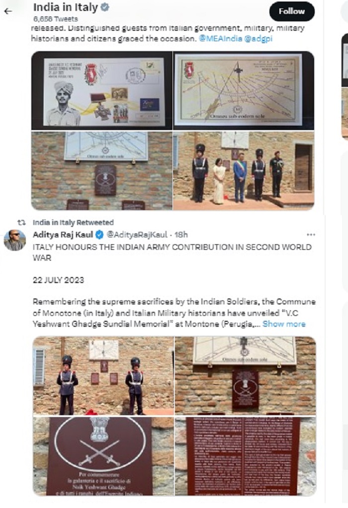 ਪੇਰੂਗੀਆ (ਏਐਨਆਈ): ਭਾਰਤੀ ਸੈਨਿਕਾਂ ਦੀਆਂ ਮਹਾਨ ਕੁਰਬਾਨੀਆਂ ਨੂੰ ਯਾਦ ਕਰਦੇ ਹੋਏ ਮੋਨੋਟੋਨ ਦੇ ਕਮਿਊਨ ਅਤੇ ਇਤਾਲਵੀ ਫੌਜੀ ਇਤਿਹਾਸਕਾਰਾਂ ਨੇ ਸ਼ਨੀਵਾਰ ਨੂੰ ਇਟਲੀ ਦੇ ਪੇਰੂਗੀਆ ਦੇ ਮੋਂਟੋਨ ਵਿੱਚ "ਵੀ.ਸੀ. ਯਸ਼ਵੰਤ ਘਾਡਗੇ ਸੁਨਡਿਅਲ ਮੈਮੋਰੀਅਲ" ਦਾ ਉਦਘਾਟਨ ਕੀਤਾ। ਜੋ ਦੂਜੇ ਵਿਸ਼ਵ ਯੁੱਧ ਦੇ ਦੌਰਾਨ ਇਟਾਲੀਅਨ ਮੁਹਿੰਮ ਦੌਰਾਨ ਲੜਨ ਵਾਲੇ ਭਾਰਤੀ ਫੌਜੀਆਂ ਨੂੰ ਸ਼ਰਧਾਂਜਲੀ ਦੇ ਰੂਪ ਵਿਚ ਸੀ। ਰੱਖਿਆ ਮੰਤਰਾਲੇ ਦੀ ਇੱਕ ਅਧਿਕਾਰਤ ਰਿਲੀਜ਼ ਵਿੱਚ ਕਿਹਾ ਗਿਆ ਕਿ ਇਸ ਸਮਾਰਕ ਦਾ ਨਾਮ ਵਿਕਟੋਰੀਆ ਕਰਾਸ ਦੇ ਨਾਇਕ ਯਸ਼ਵੰਤ ਘਾਡਗੇ, ਦੇ ਨਾਮ 'ਤੇ ਰੱਖਿਆ ਗਿਆ ਹੈ, ਜੋ ਕਿ ਅੱਪਰ ਟਾਈਬਰ ਵੈਲੀ ਦੀਆਂ ਉਚਾਈਆਂ 'ਤੇ ਲੜਾਈ ਦੌਰਾਨ ਮਾਰਿਆ ਗਿਆ ਸੀ।