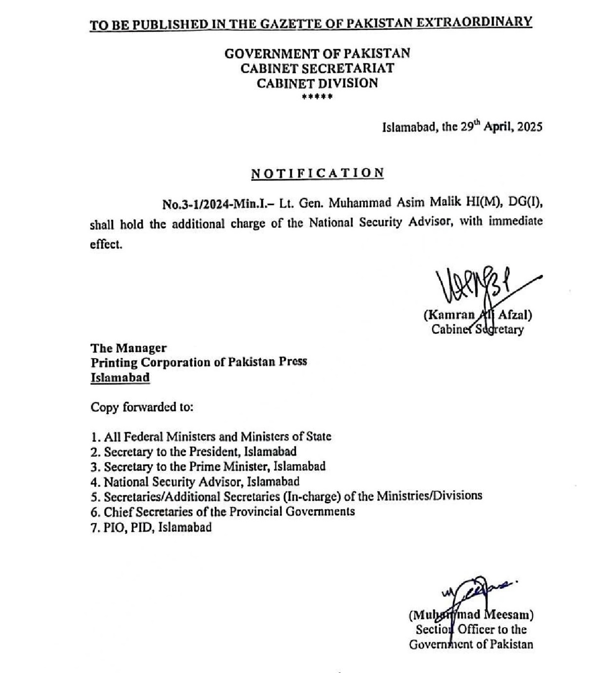 ਪਾਕਿਸਤਾਨ ਦੇ ਅਖ਼ਬਾਰ 'ਦਿ ਐਕਸਪ੍ਰੈਸ ਟ੍ਰਿਬਿਊਨ' ਦੀ ਇੱਕ ਰਿਪੋਰਟ ਮੁਤਾਬਕ, ਅਸੀਮ ਮਲਿਕ ਨੂੰ ਇਹ ਜ਼ਿੰਮੇਵਾਰੀ 'ਵਾਧੂ ਚਾਰਜ' ਵਜੋਂ ਸੌਂਪੀ ਗਈ ਹੈ। ਇਸ ਨਿਯੁਕਤੀ ਲਈ ਰਸਮੀ ਹੁਕਮ ਵੀ ਜਾਰੀ ਕਰ ਦਿੱਤਾ ਗਿਆ ਹੈ। ਮੰਨਿਆ ਜਾ ਰਿਹਾ ਹੈ ਕਿ ਪਾਕਿਸਤਾਨ ਨੇ ਇਹ ਕਦਮ ਭਾਰਤ ਦੇ ਫੈਸਲਾਕੁੰਨ ਜਵਾਬ ਦੇ ਮੱਦੇਨਜ਼ਰ ਚੁੱਕਿਆ ਹੈ। ਦੱਸਣਯੋਗ ਹੈ ਕਿ ਅਸੀਮ ਮਲਿਕ ਨੂੰ ਪਿਛਲੇ ਸਾਲ ਸਤੰਬਰ ਵਿੱਚ ਆਈਐੱਸਆਈ ਮੁਖੀ ਨਿਯੁਕਤ ਕੀਤਾ ਗਿਆ ਸੀ।