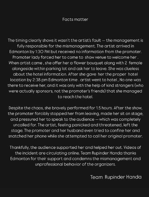 ਇਸ ਦੌਰਾਨ ਰੁਪਿੰਦਰ ਹਾਂਡਾ ਦੇ ਆਫੀਸ਼ੀਅਲ ਪੇਜ 'ਤੇ ਪੋਸਟ ਪਾਈ ਗਈ ਤੇ ਕਿਹਾ ਕਿ ਤੱਥ ਮਾਇਨੇ ਰੱਖਦੇ ਹਨ, ਸ਼ੋਅ ਦੀ ਟਾਈਮਿੰਗ ਤੋਂ ਸਪੱਸ਼ਟ ਤੌਰ ਹੈ ਕਿ ਇਹ ਕਲਾਕਾਰ ਦੀ ਗਲਤੀ ਨਹੀਂ ਸੀ - ਪ੍ਰਬੰਧਨ ਕੁਪ੍ਰਬੰਧਨ ਲਈ ਪੂਰੀ ਤਰ੍ਹਾਂ ਜ਼ਿੰਮੇਵਾਰ ਹੈ। ਕਲਾਕਾਰ ਦੁਪਹਿਰ 1:30 ਵਜੇ ਐਡਮਿੰਟਨ ਪਹੁੰਚ ਗਿਆ ਪਰ ਪ੍ਰਮੋਟਰ ਤੋਂ ਕੋਈ ਸੂਚਨਾ ਨਹੀਂ ਮਿਲੀ। ਪ੍ਰਮੋਟਰ ਮਹਿਲਾ ਨੇ ਉਸ ਦੇ ਸਵਾਗਤ ਲਈ ਸ਼ੋਅ ਵਾਲੀ ਥਾਂ 'ਤੇ ਆਉਣ ਲਈ ਮਜਬੂਰ ਕੀਤਾ। ਜਦੋਂ ਕਲਾਕਾਰ ਆਇਆ ਤਾਂ ਉਸਨੇ ਪਾਰਕਿੰਗ ਵਿੱਚ 2 ਔਰਤਾਂ ਦੇ ਨਾਲ ਇੱਕ ਫੁੱਲਾਂ ਦਾ ਗੁਲਦਸਤਾ ਪੇਸ਼ ਕੀਤਾ ਅਤੇ ਉਸਨੂੰ ਜਾਣ ਲਈ ਕਿਹਾ। ਉਹ ਹੋਟਲ ਦੀ ਜਾਣਕਾਰੀ ਤੋਂ ਅਣਜਾਣ ਸੀ। ਐਡਮਿੰਟਨ ਦੇ ਸਮੇਂ ਅਨੁਸਾਰ ਦੁਪਹਿਰ 2:38 ਵਜੇ ਉਸਨੇ ਉਸਨੂੰ ਹੋਟਲ ਦਾ ਸਹੀ ਸਥਾਨ ਦਿੱਤਾ। ਕਲਾਕਾਰ ਹੋਟਲ ਵਿੱਚ ਗਿਆ, ਉਸ ਨੂੰ ਰਿਸੀਵ ਕਰਨ ਲਈ ਕੋਈ ਵੀ ਨਹੀਂ ਸੀ ਅਤੇ ਇਹ ਸਿਰਫ਼ ਅਜਨਬੀਆਂ (ਜੋ ਅਸਲ ਵਿੱਚ ਸਪਾਂਸਰ ਸਨ, ਪ੍ਰਮੋਟਰ ਦੇ ਦੋਸਤ ਨਹੀਂ ਸਨ) ਦੀ ਮਦਦ ਨਾਲ ਉਹ ਹੋਟਲ ਤੱਕ ਪਹੁੰਚਣ ਵਿੱਚ ਕਾਮਯਾਬ ਹੋਈ।