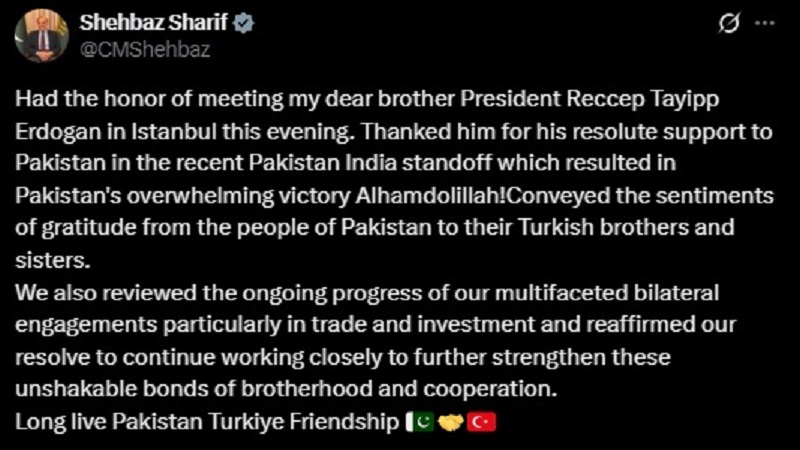 ਸਰਕਾਰੀ ਪ੍ਰਸਾਰਕ ਪੀਟੀਵੀ ਨਿਊਜ਼ ਅਨੁਸਾਰ ਸ਼ਰੀਫ ਅਤੇ ਏਰਦੋਗਨ ਨੇ ਐਤਵਾਰ ਨੂੰ ਇੱਕ ਵਫ਼ਦ-ਪੱਧਰੀ ਮੀਟਿੰਗ ਕੀਤੀ। ਏਰਦੋਗਨ ਨਾਲ ਆਪਣੀ ਮੁਲਾਕਾਤ ਵਿੱਚ ਸ਼ਰੀਫ ਨੇ ਸਾਂਝੇ ਉੱਦਮਾਂ ਅਤੇ ਦੁਵੱਲੇ ਨਿਵੇਸ਼ਾਂ ਨੂੰ ਵਧਾਉਣ ਦੀ ਵਕਾਲਤ ਕੀਤੀ ਅਤੇ ਨਵਿਆਉਣਯੋਗ ਊਰਜਾ, ਸੂਚਨਾ ਤਕਨਾਲੋਜੀ, ਰੱਖਿਆ ਉਤਪਾਦਨ, ਬੁਨਿਆਦੀ ਢਾਂਚਾ ਵਿਕਾਸ ਅਤੇ ਖੇਤੀਬਾੜੀ ਵਰਗੇ ਮੁੱਖ ਖੇਤਰਾਂ ਨੂੰ ਆਪਸੀ ਹਿੱਤ ਦੇ ਸੰਭਾਵੀ ਖੇਤਰਾਂ ਵਜੋਂ ਉਜਾਗਰ ਕੀਤਾ। ਦੋਵਾਂ ਆਗੂਆਂ ਨੇ ਦੁਵੱਲੇ ਸਬੰਧਾਂ ਦੇ ਸਮੁੱਚੇ ਪਹਿਲੂਆਂ ਦੀ ਵਿਆਪਕ ਸਮੀਖਿਆ ਕੀਤੀ ਅਤੇ ਰਣਨੀਤਕ ਭਾਈਵਾਲੀ ਨੂੰ ਵਧਾਉਣ ਦੇ ਆਪਣੇ ਸੰਕਲਪ ਨੂੰ ਦੁਹਰਾਇਆ। ਸ਼ਰੀਫ ਨੇ 'ਐਕਸ' 'ਤੇ ਲਿਖਿਆ,"ਅਸੀਂ ਆਪਣੇ ਬਹੁਪੱਖੀ ਦੁਵੱਲੇ ਸਬੰਧਾਂ, ਖਾਸ ਕਰਕੇ ਵਪਾਰ ਅਤੇ ਨਿਵੇਸ਼ ਵਿੱਚ ਚੱਲ ਰਹੀ ਪ੍ਰਗਤੀ ਦੀ ਵੀ ਸਮੀਖਿਆ ਕੀਤੀ। ਉਨ੍ਹਾਂ ਨੇ ਭਾਈਚਾਰੇ ਅਤੇ ਸਹਿਯੋਗ ਦੇ ਇਨ੍ਹਾਂ ਅਟੁੱਟ ਬੰਧਨਾਂ ਨੂੰ ਹੋਰ ਮਜ਼ਬੂਤ ਕਰਨ ਲਈ ਇਕੱਠੇ ਕੰਮ ਕਰਨਾ ਜਾਰੀ ਰੱਖਣ ਦੇ ਆਪਣੇ ਸੰਕਲਪ ਦੀ ਪੁਸ਼ਟੀ ਕੀਤੀ।" ਸ਼ਰੀਫ ਨੇ ਇਸ ਮਹੀਨੇ ਭਾਰਤ ਨਾਲ ਫੌਜੀ ਟਕਰਾਅ ਦੌਰਾਨ ਆਪਣੇ ਦੇਸ਼ ਦੇ ਸਮਰਥਨ ਲਈ ਏਰਦੋਗਨ ਦਾ ਧੰਨਵਾਦ ਵੀ ਕੀਤਾ।